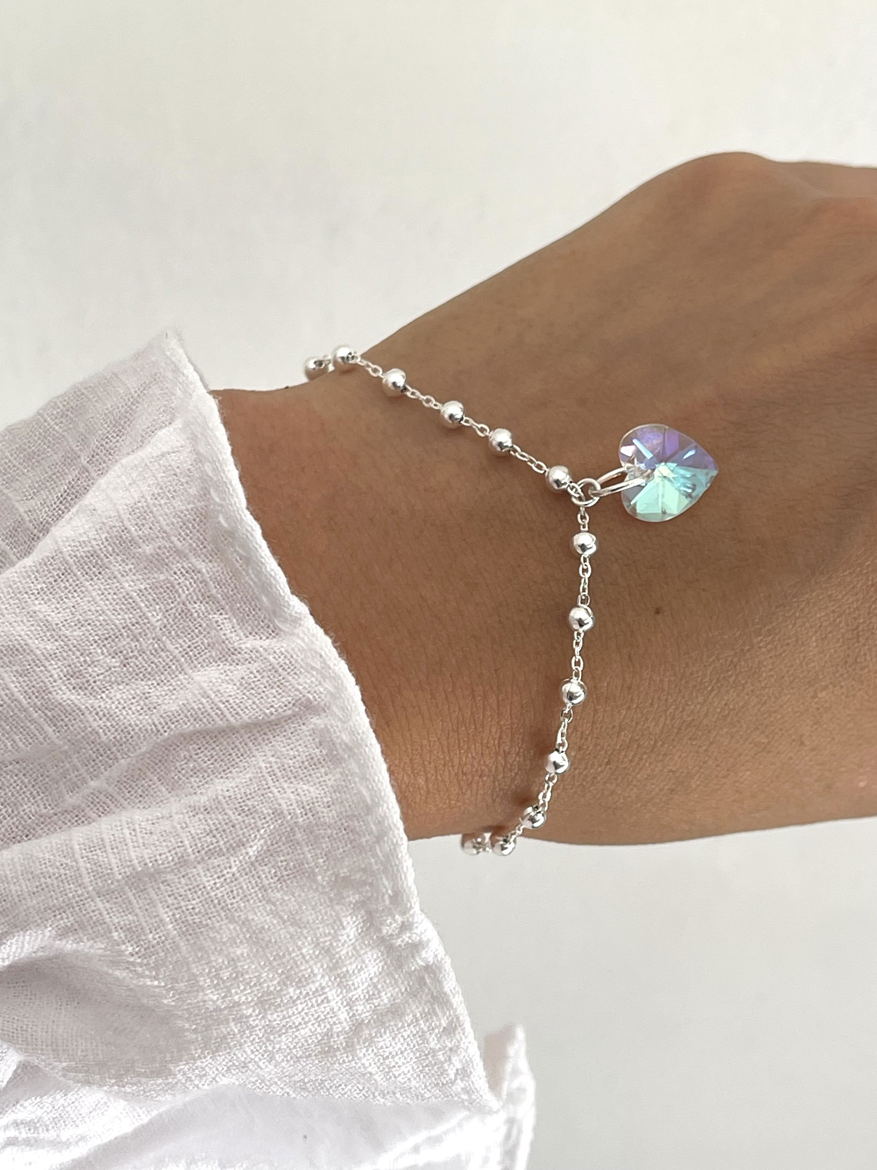 Pulseras con eslabones y bolitas con dije de cristal símil sw en forma de corazón . medidas 18 cm + 3 cm extensor