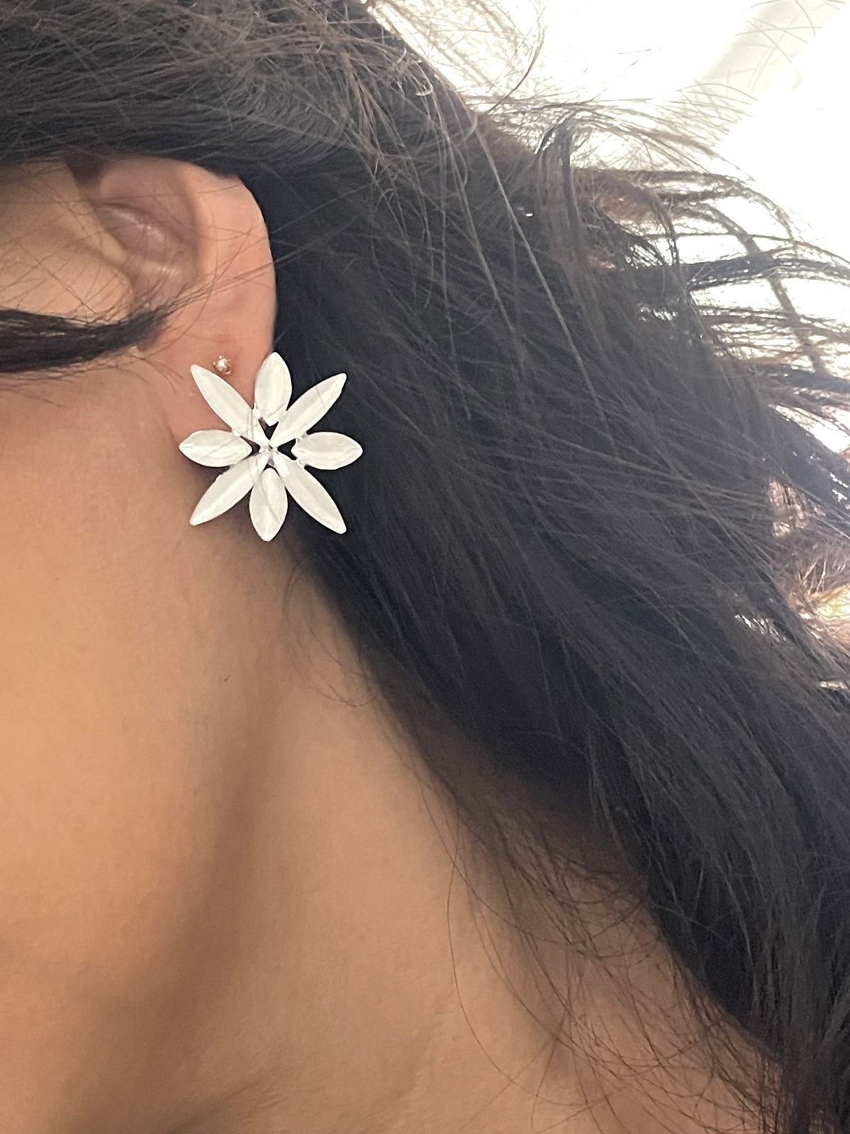 Aros pasantes en forma de flor con pétalos alargados color de gemas blancos opacos .