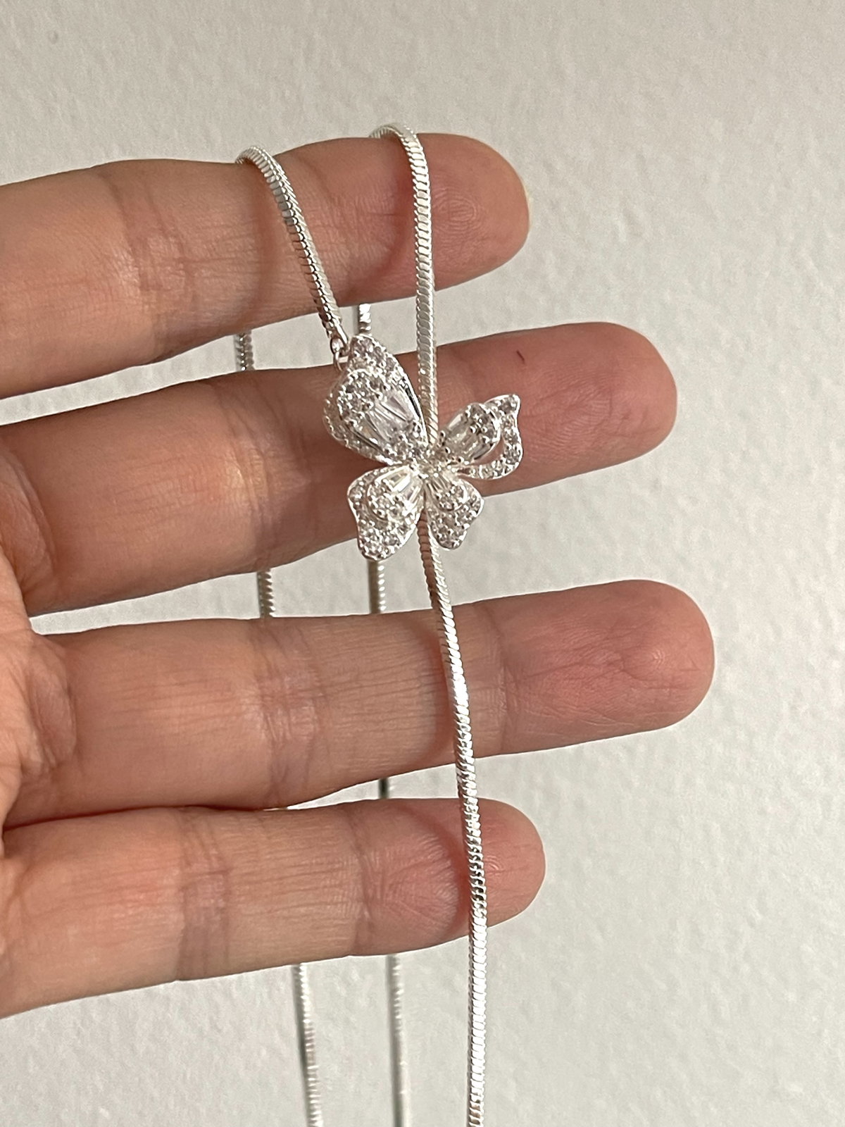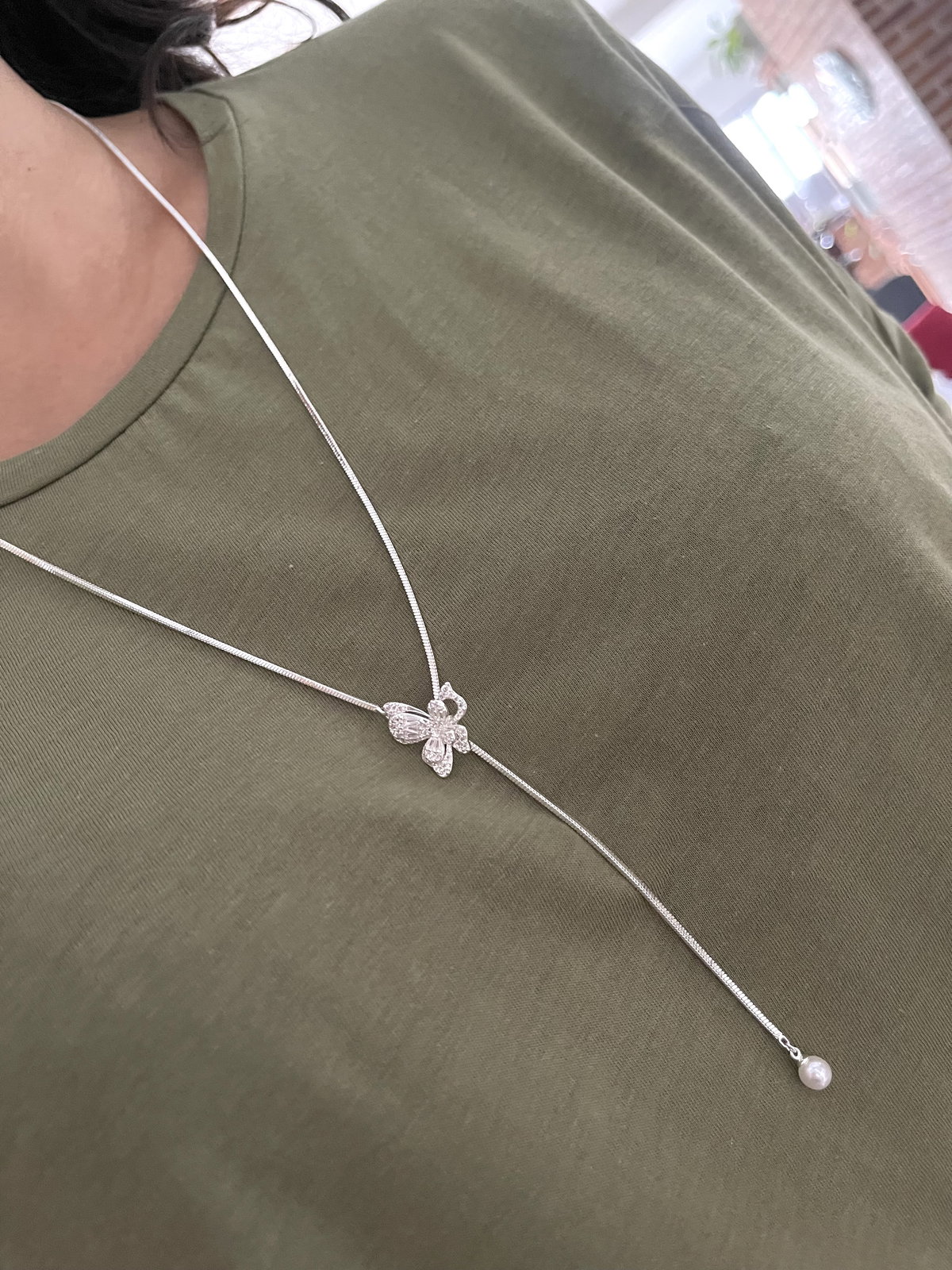Collar estilo corbatero con dije mariposa en centro y perla en la terminación .