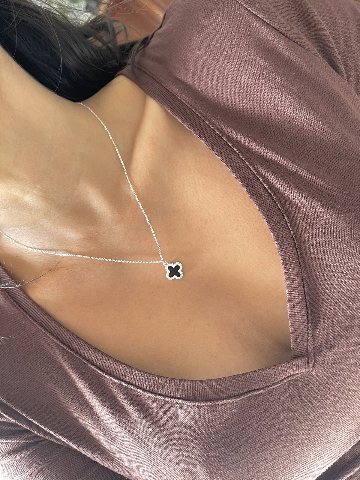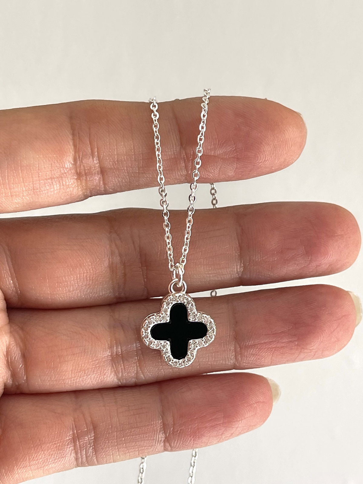 Conjunto de cadena y dije trébol inspiración van cleef color negro con micropave alrededor . Com extensor 40 cm +5 cm total 45 cm