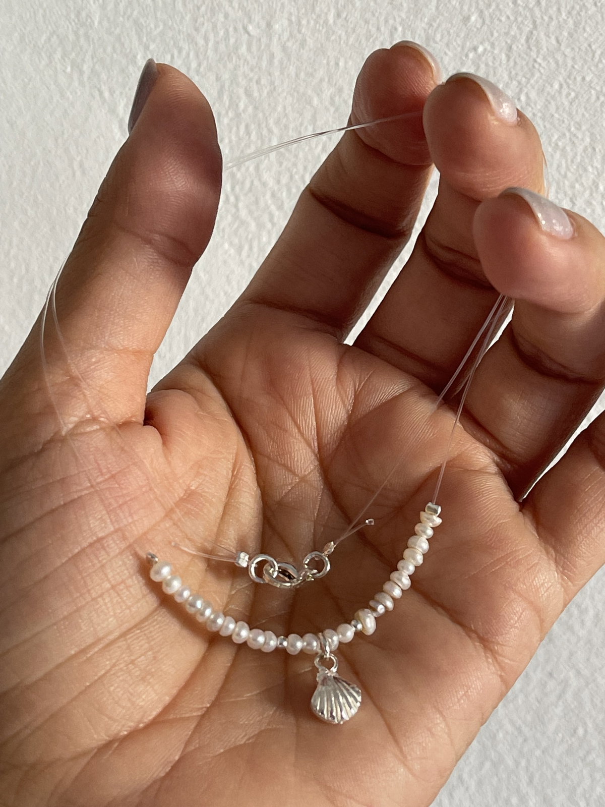 Collar invisible de tanza con perlas de cultivo de 3 mm y dije de plata de ostra . medida sin extensor . 47 cm