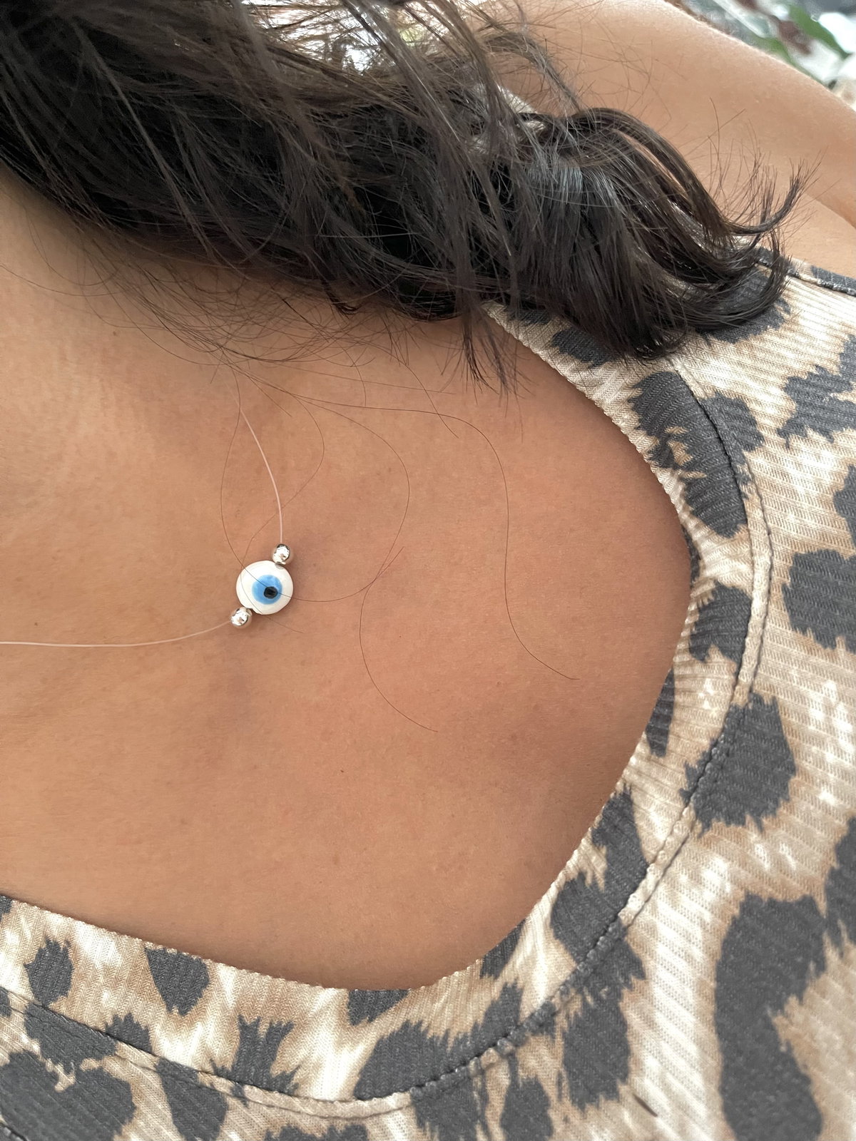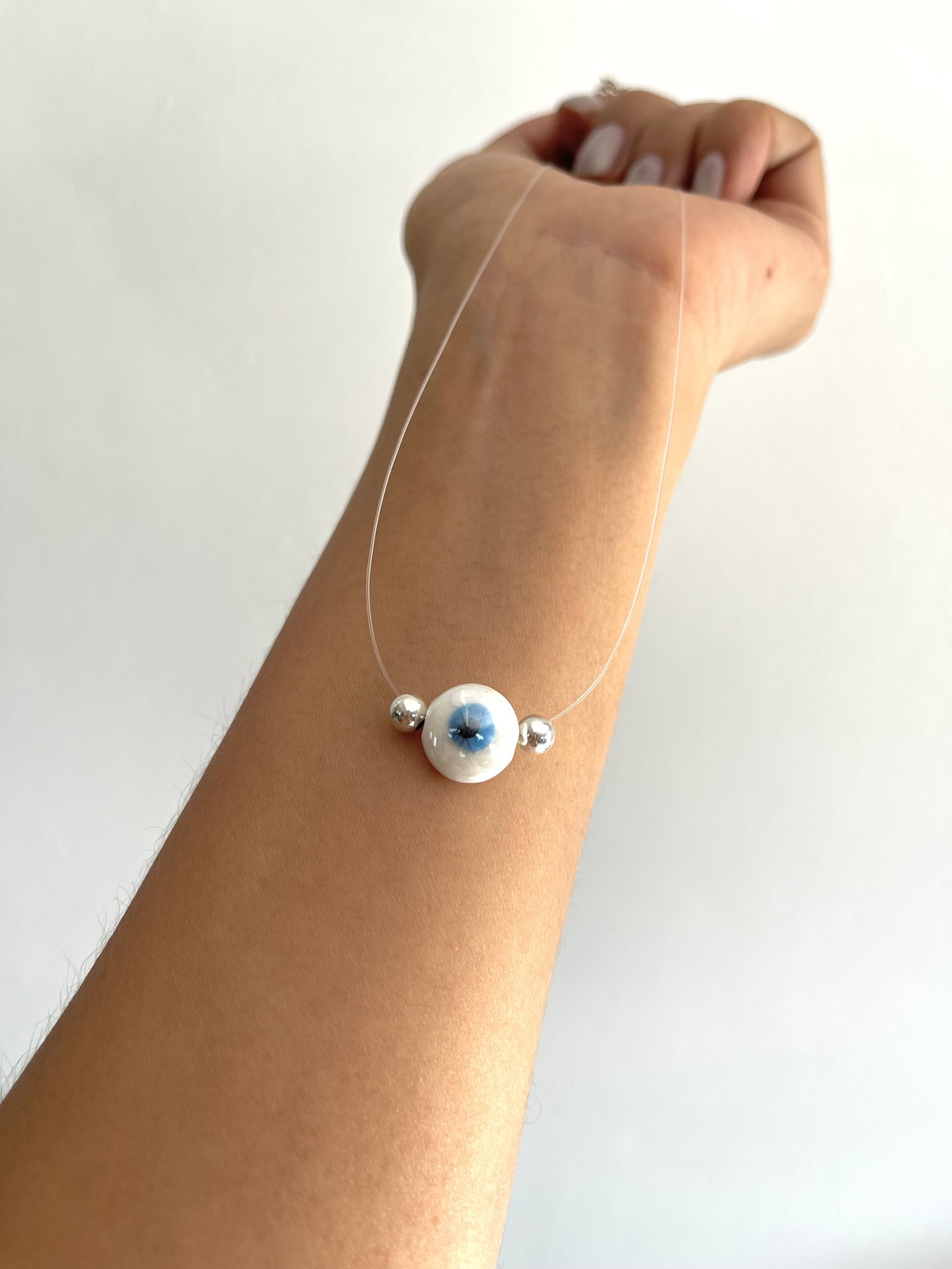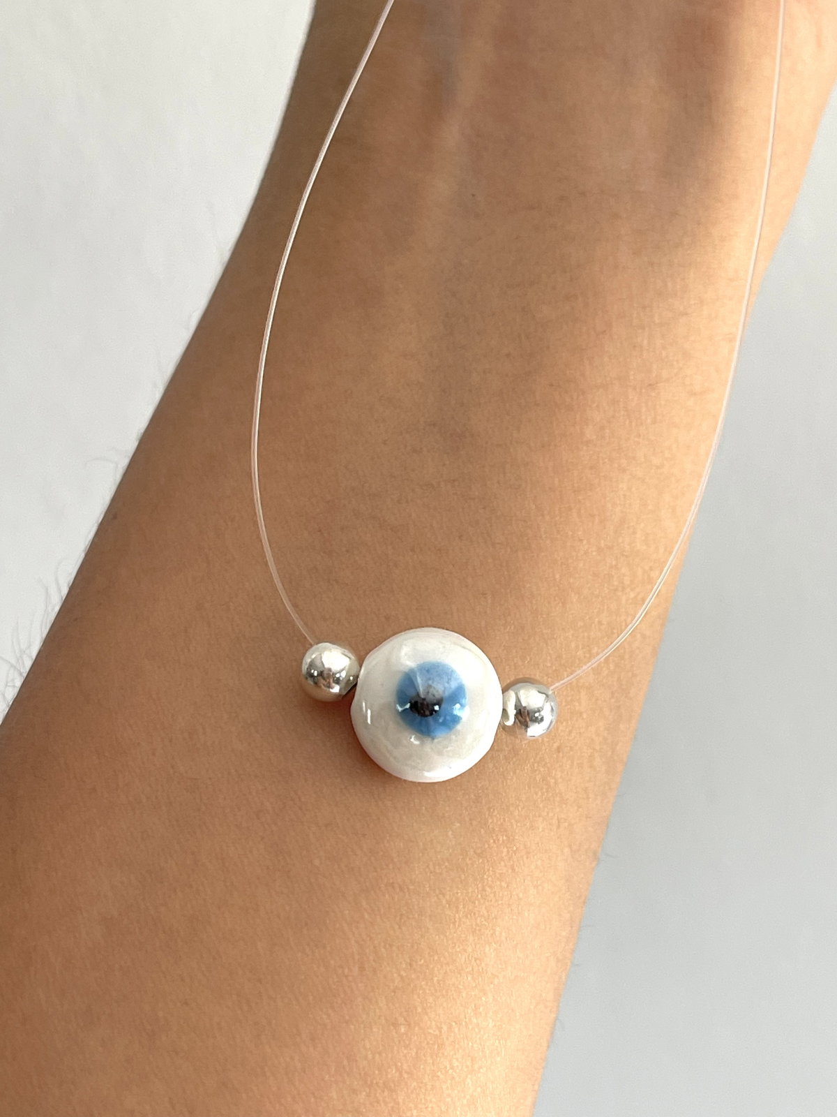 Collar invisible de tanza con terminaciones de plata 925 y dije de ojo turco en cerámica . con bolitas de 4 mm .