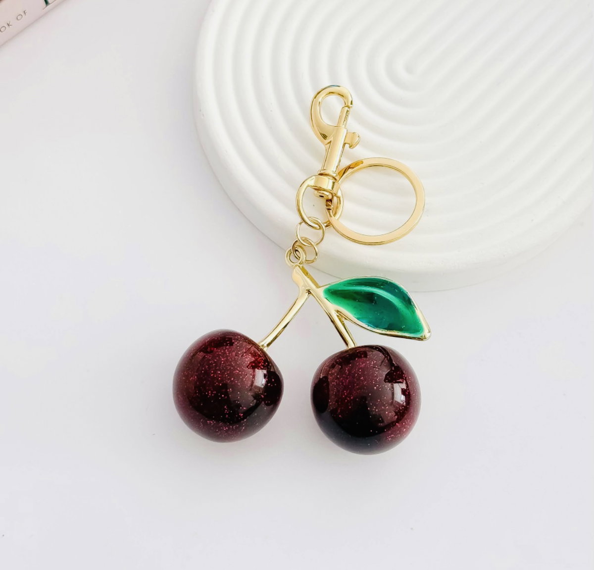 Llavero Charms para cartera mochila en forma de cereza color bordo con dorado y hoja verde esmaltado