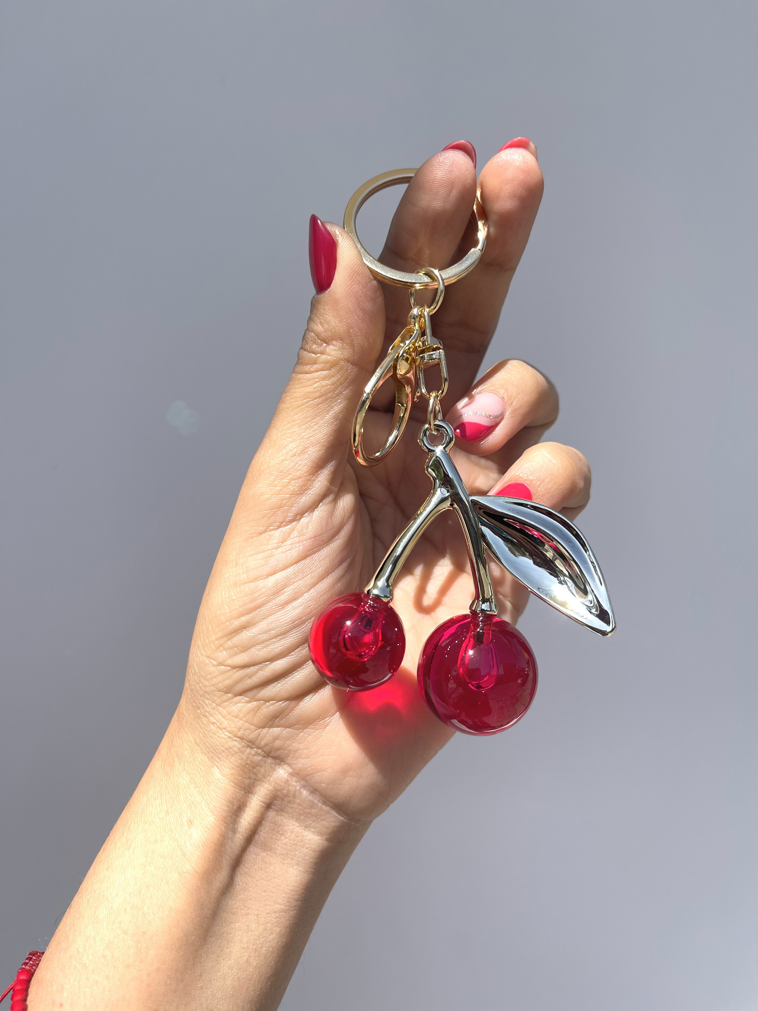 Llavero para bolso cartera o mochila cerezas color fucsias con dorado