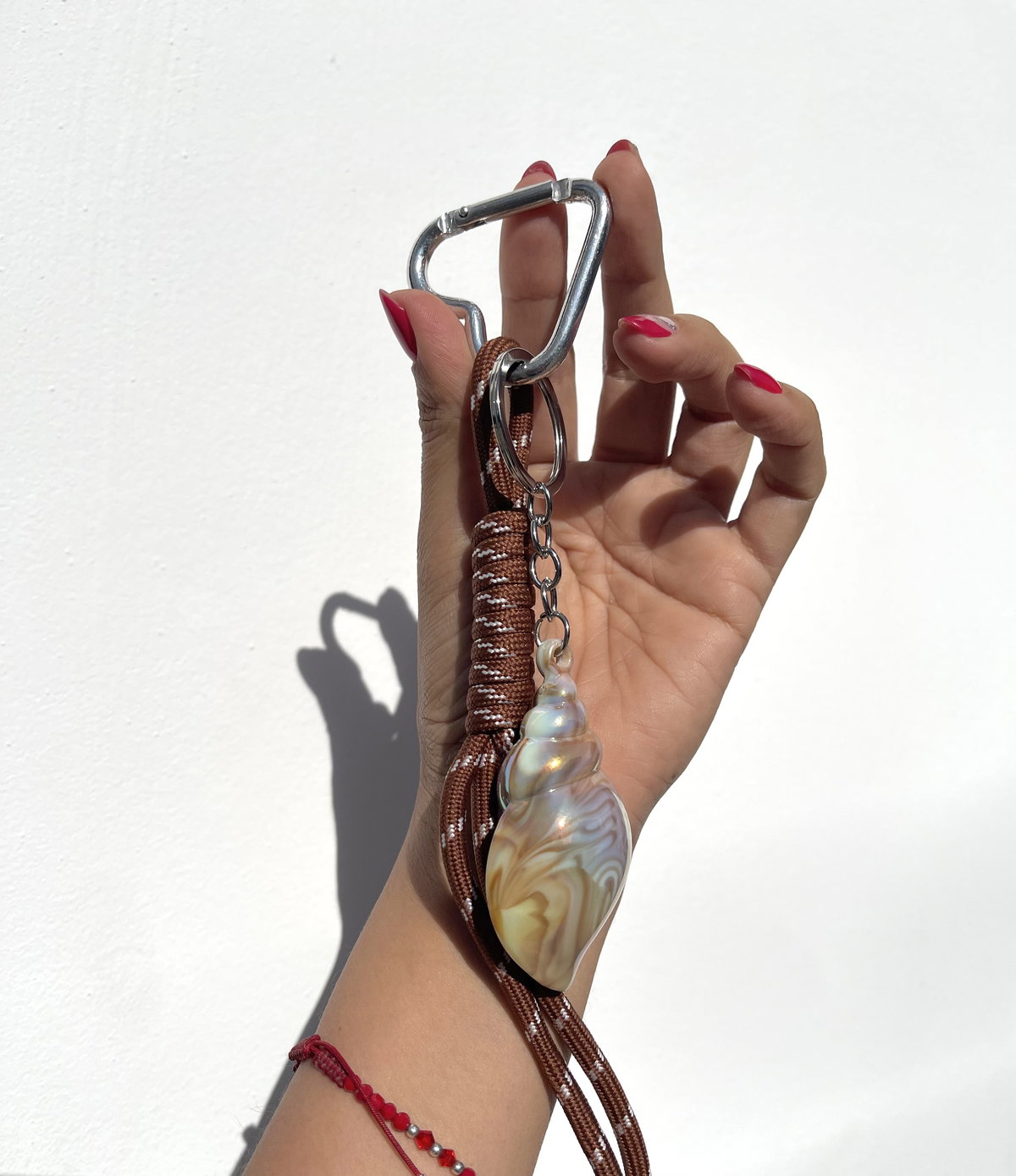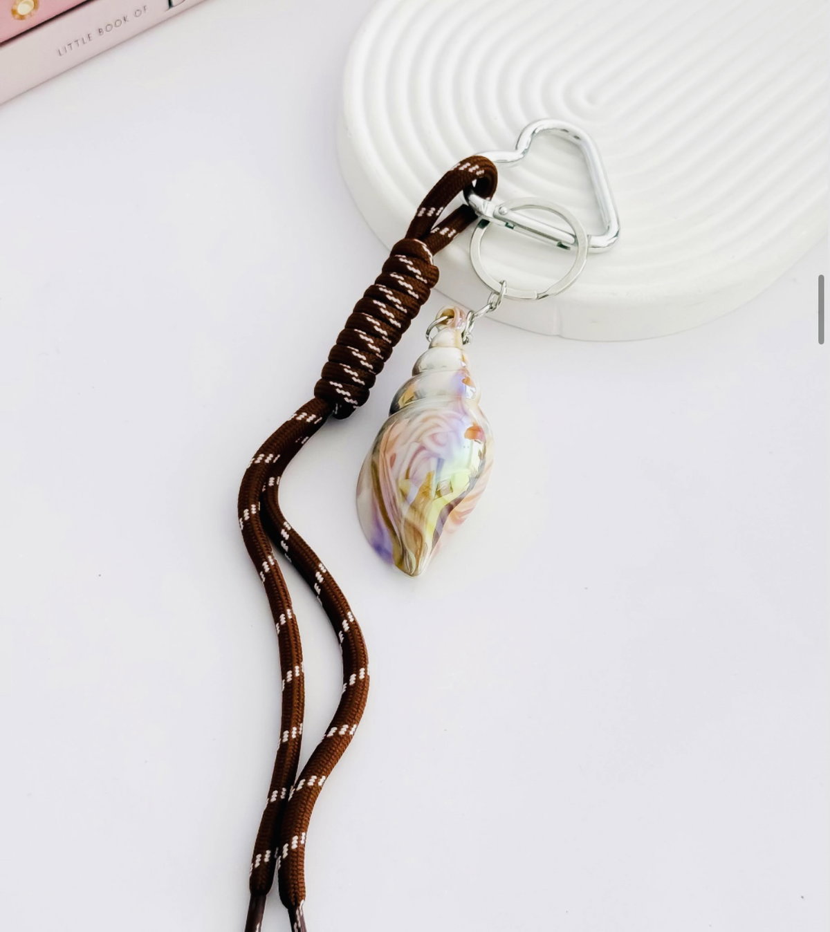 Charms llavero con caracol esmaltado tonsi blancos perlados y marrones al tono de los cordones .