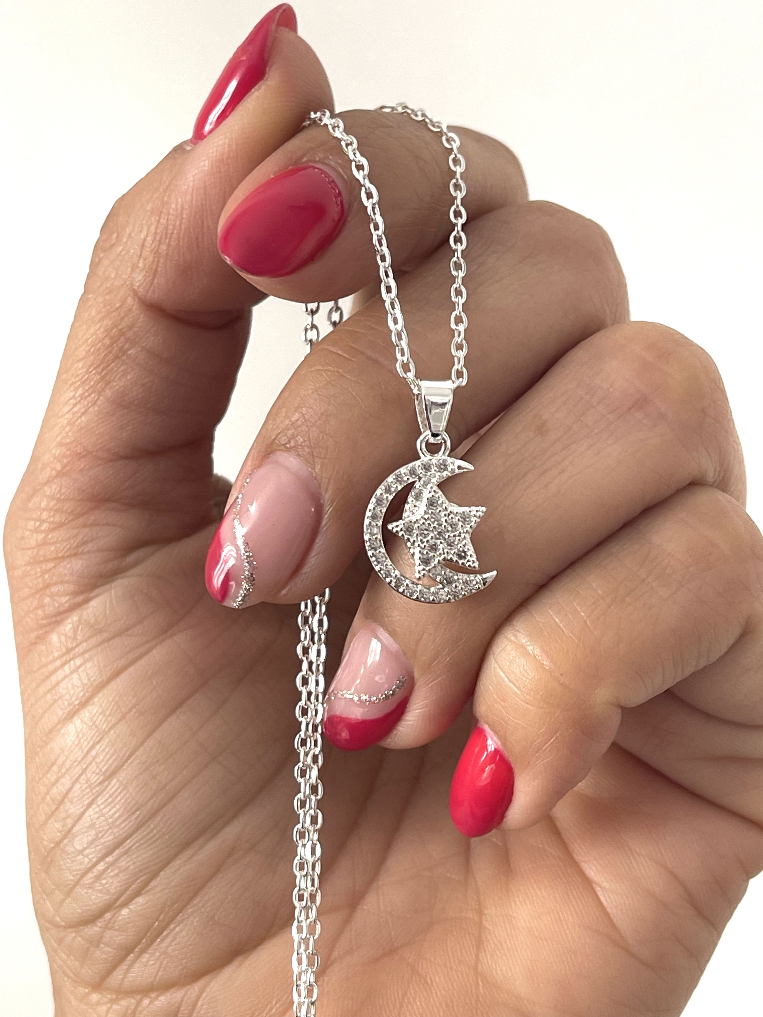 Conjunto cadena espejito con dije luna y estrella giratoria en micropave antiestrés . Medida 45 cm sin extensor