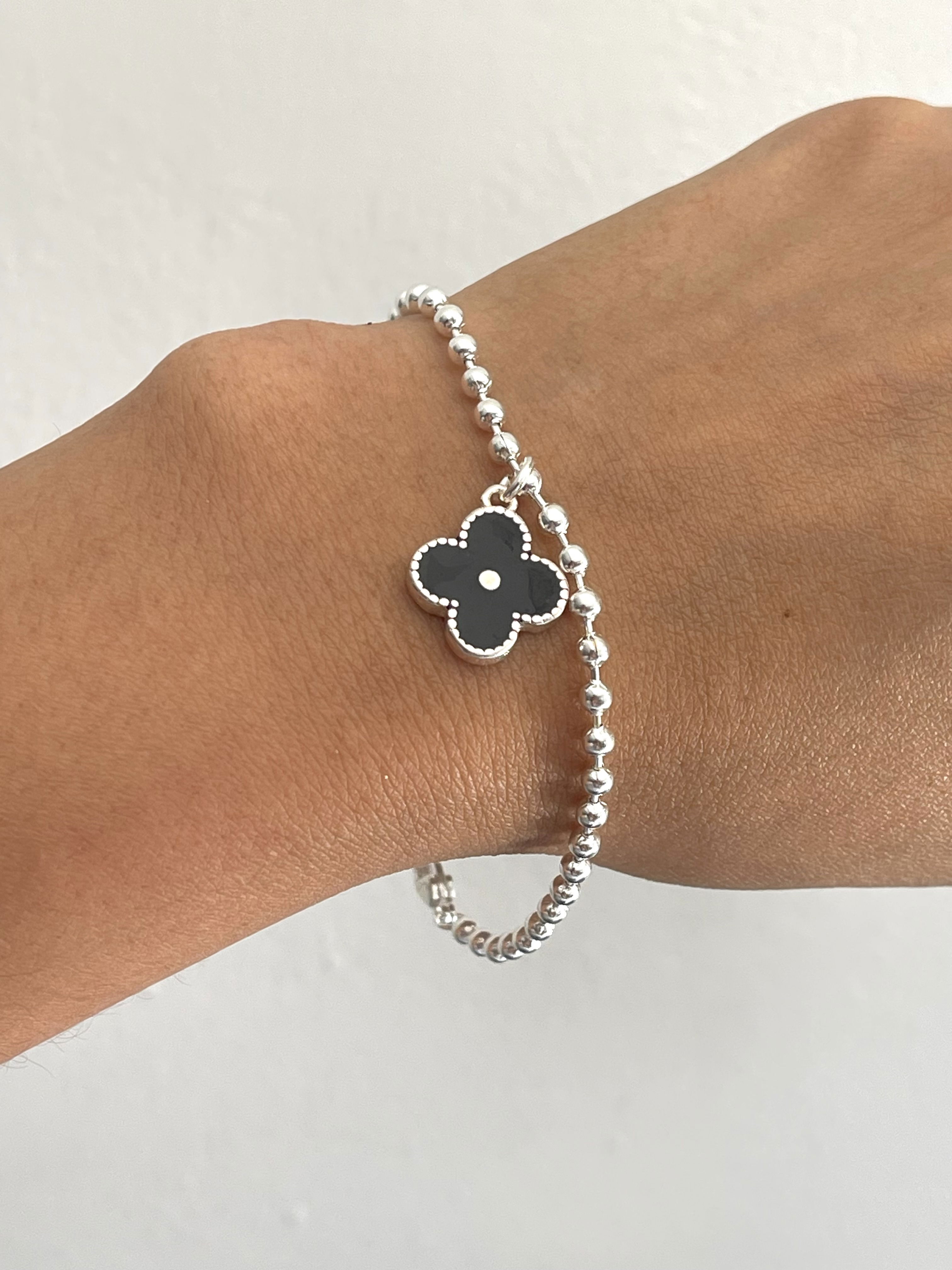 Pulsera de microbolitas con dije en forma de trébol negro .