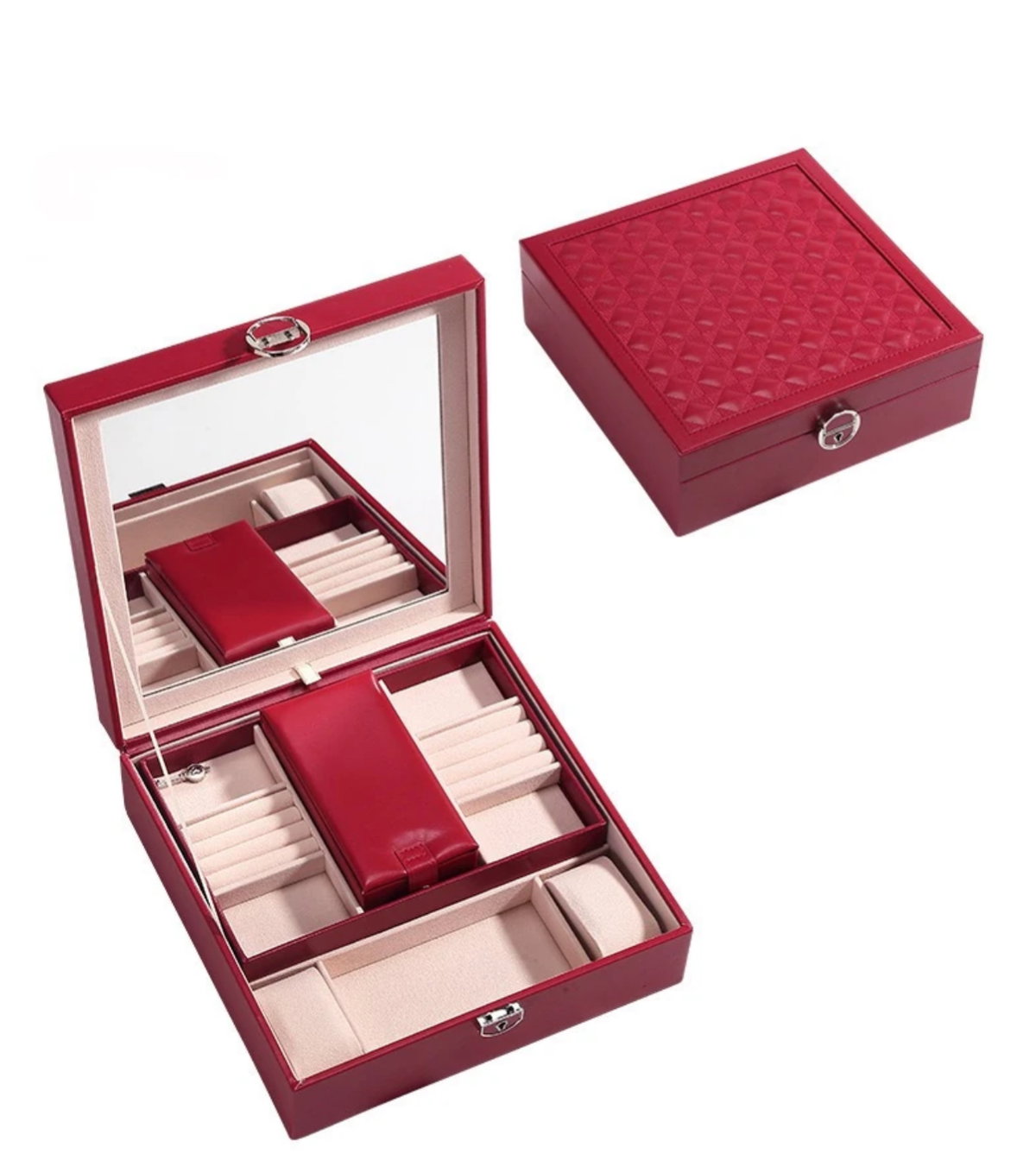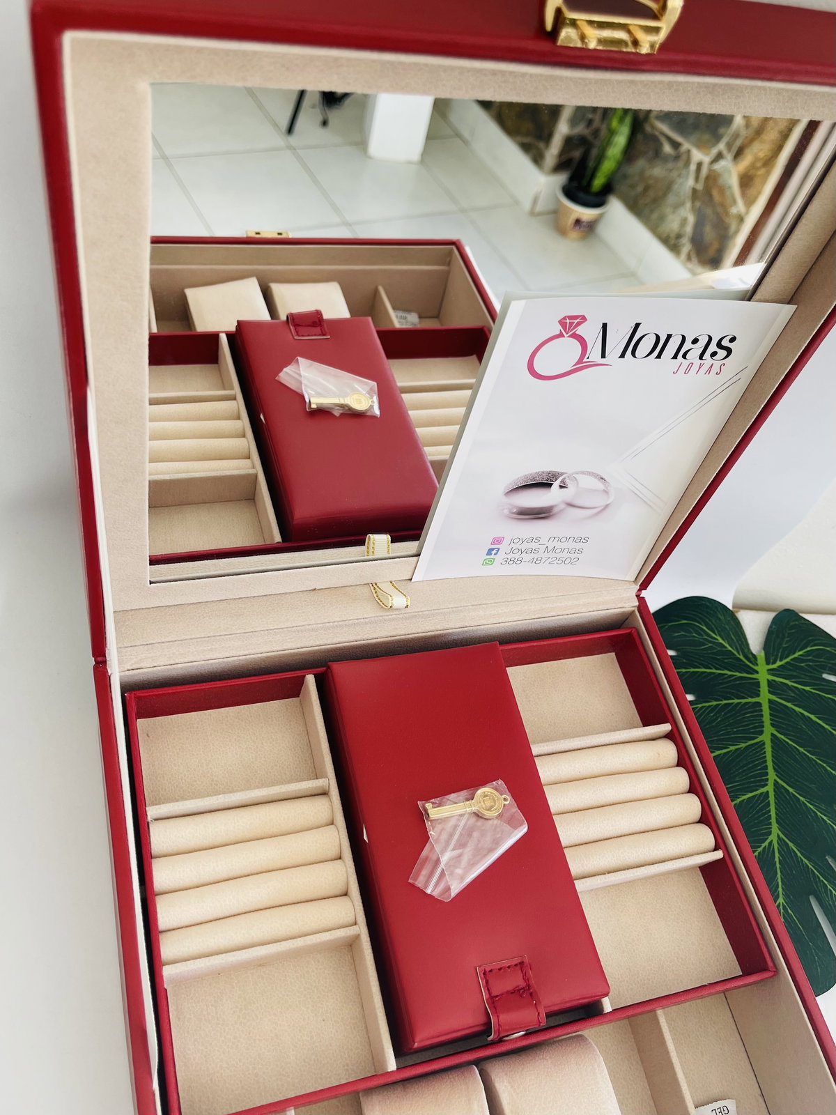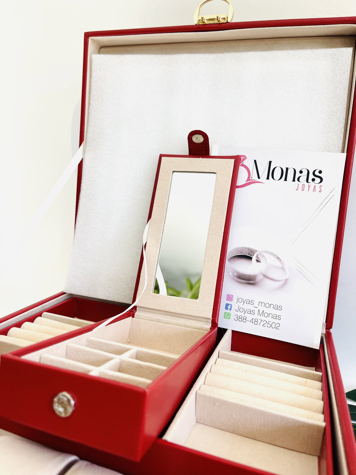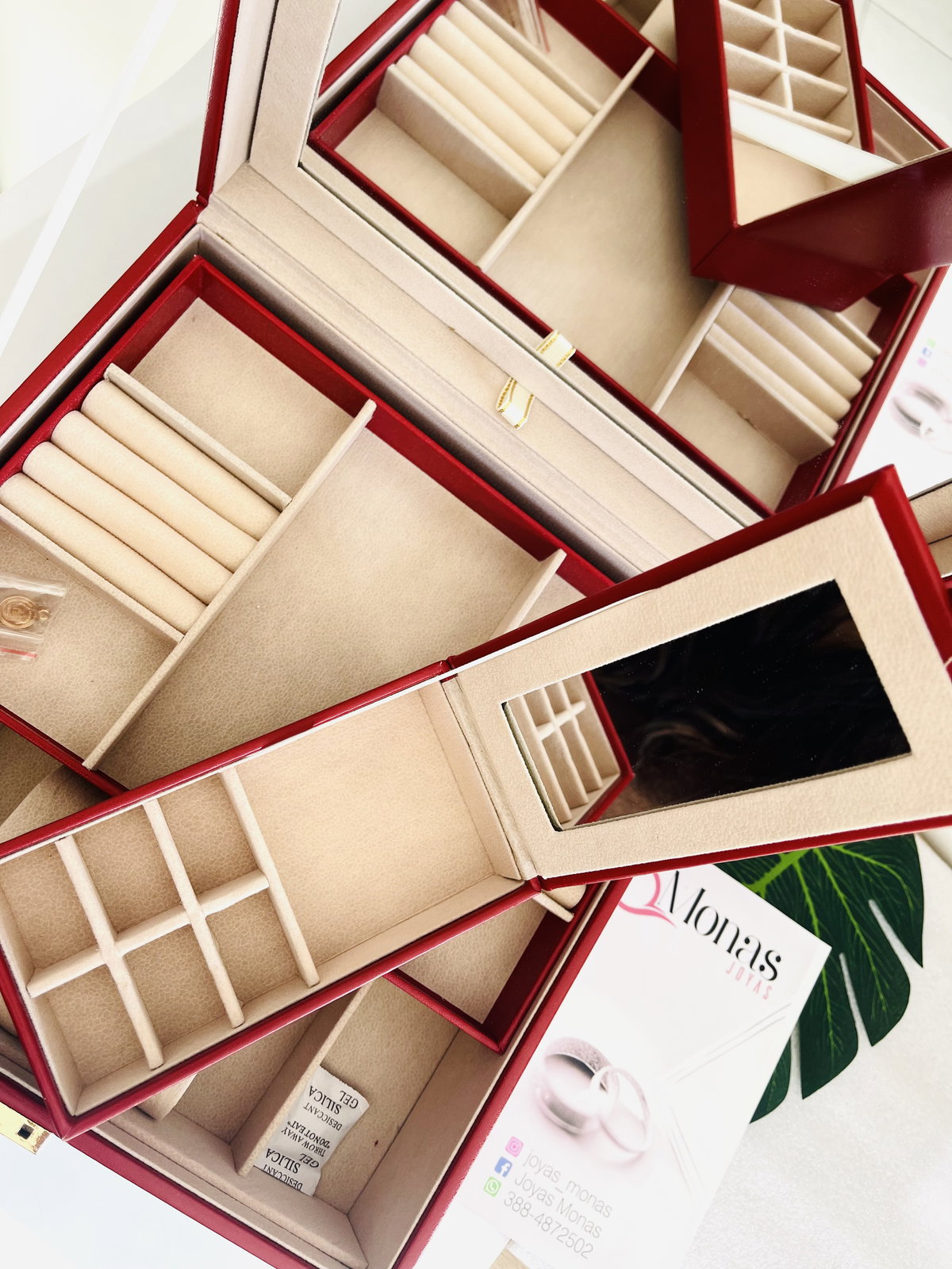 Contiene espejo , para guardar dos relojes . Anillos aros y una pequeña caja con espejo en forma rectangular para viajes .