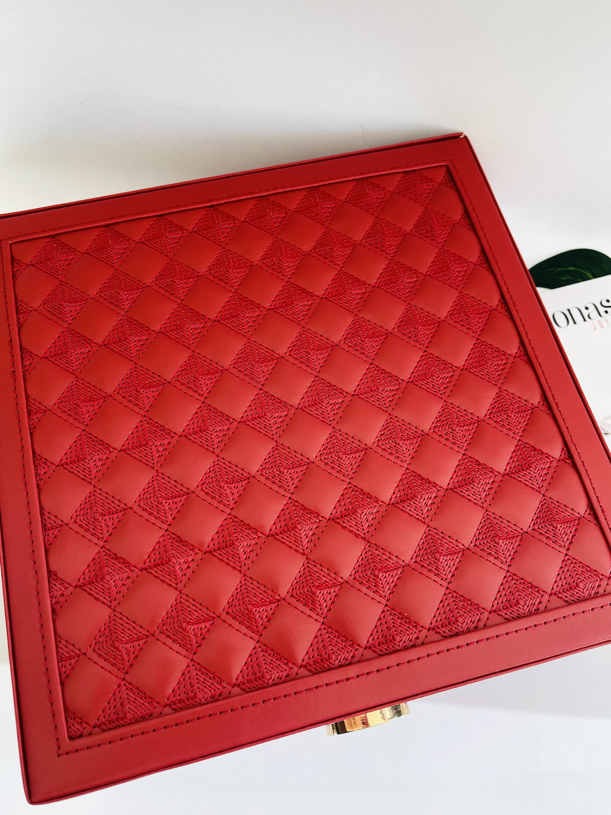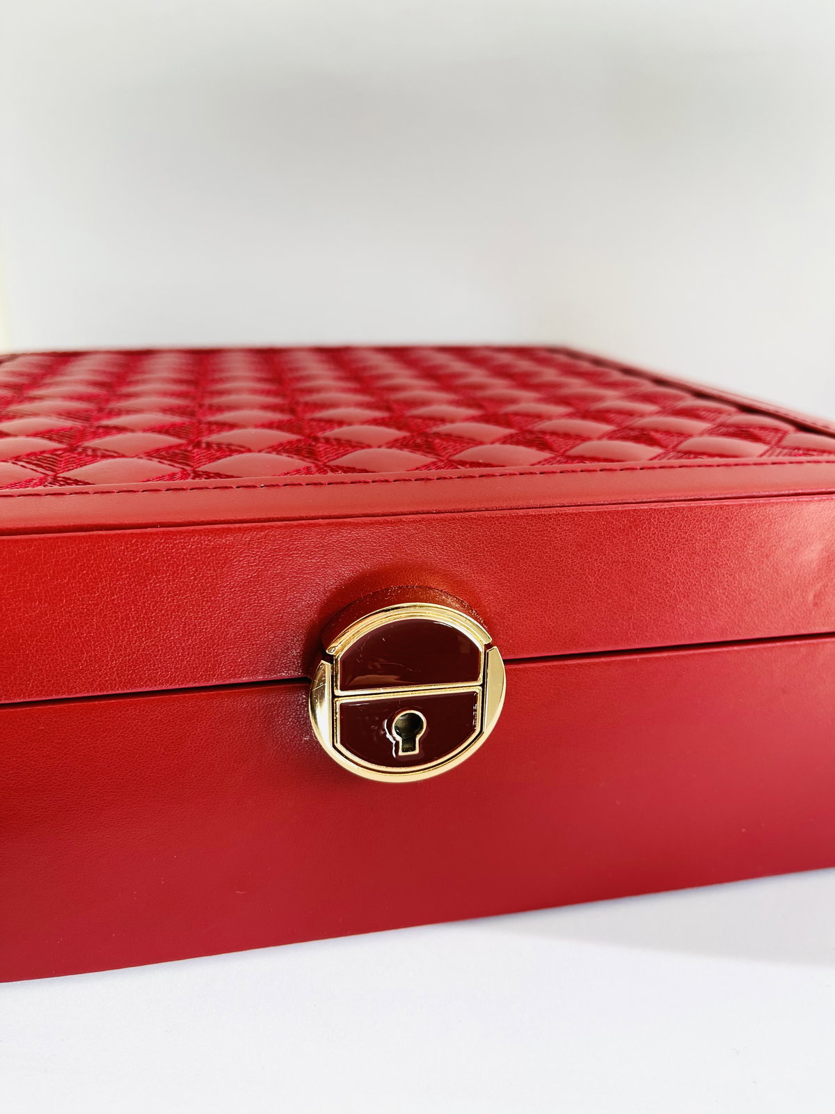 alahjero en cuero pu rojo con detalles en la tapa .