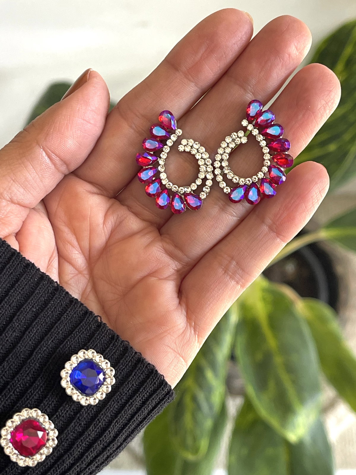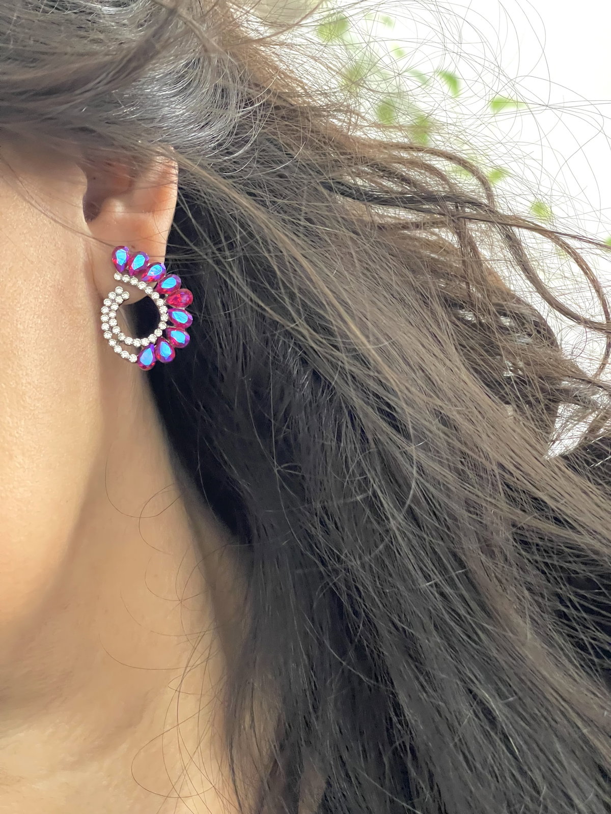 Aros pasantes de gemas fucsia y micropiedras blancas . En forma de gotas