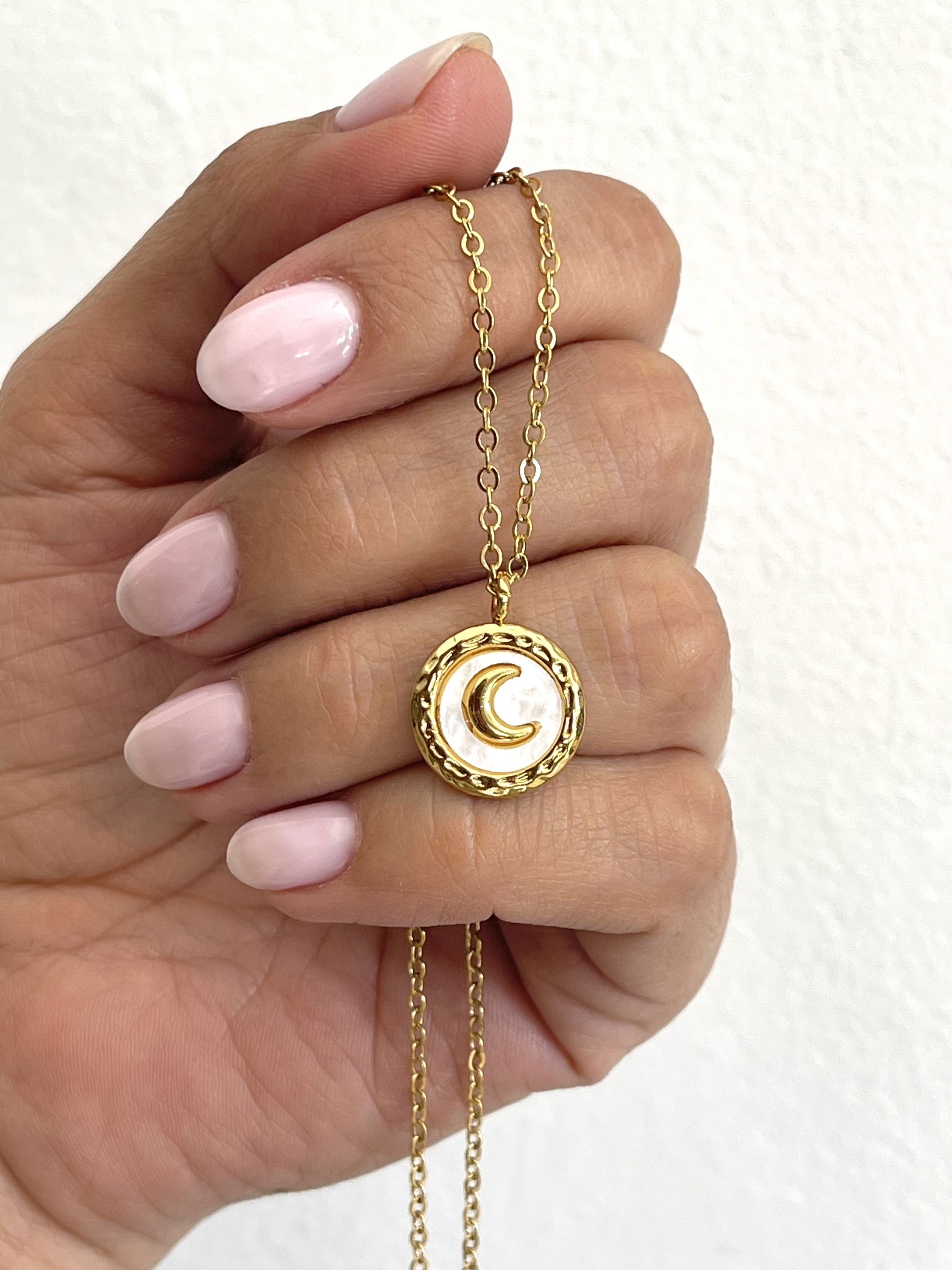 Collar con dije redondo anacarado con luna dorada .