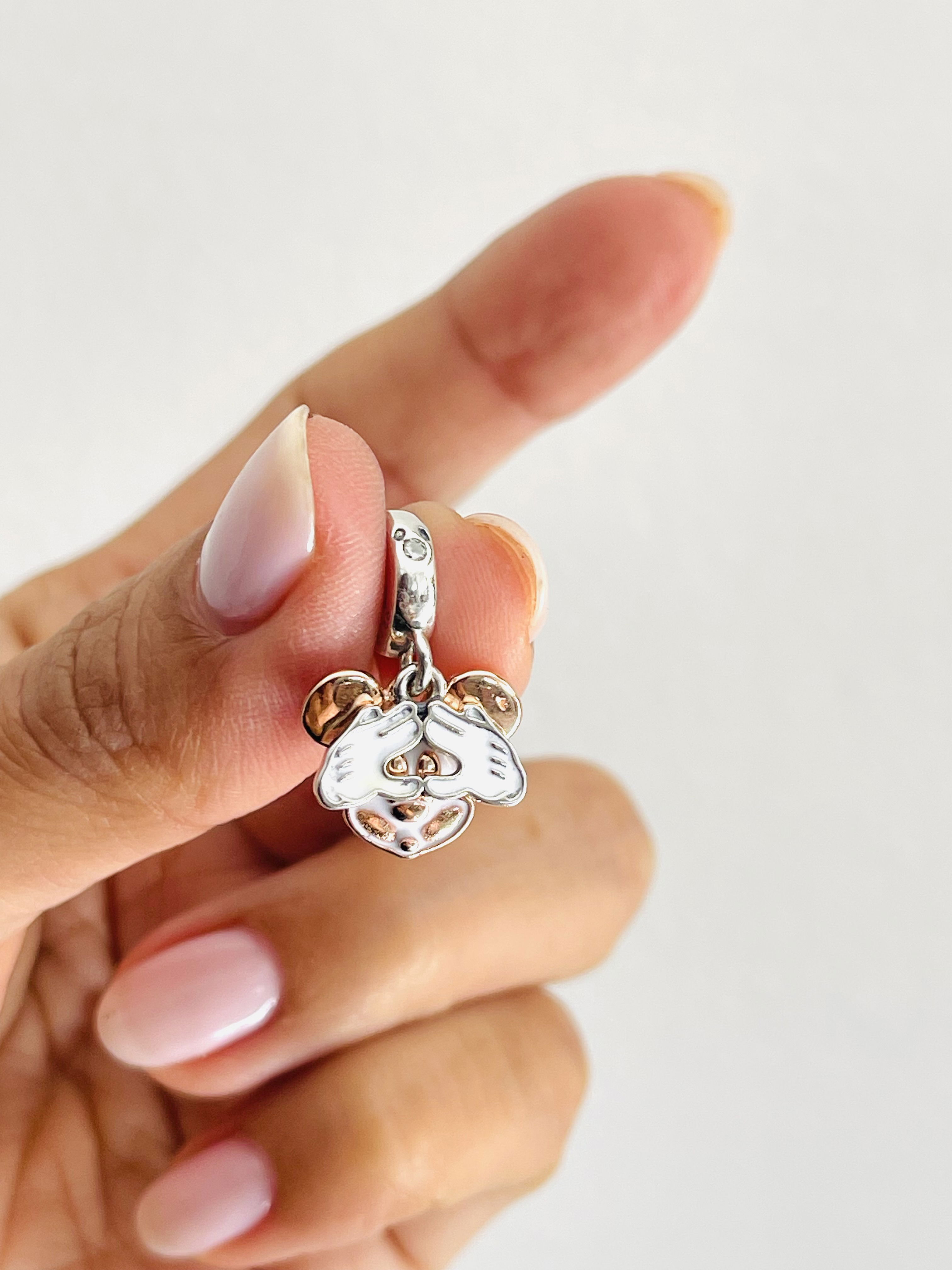 Dije Charms de Mickey mouse color rose. Y guantes blancos esmaltados