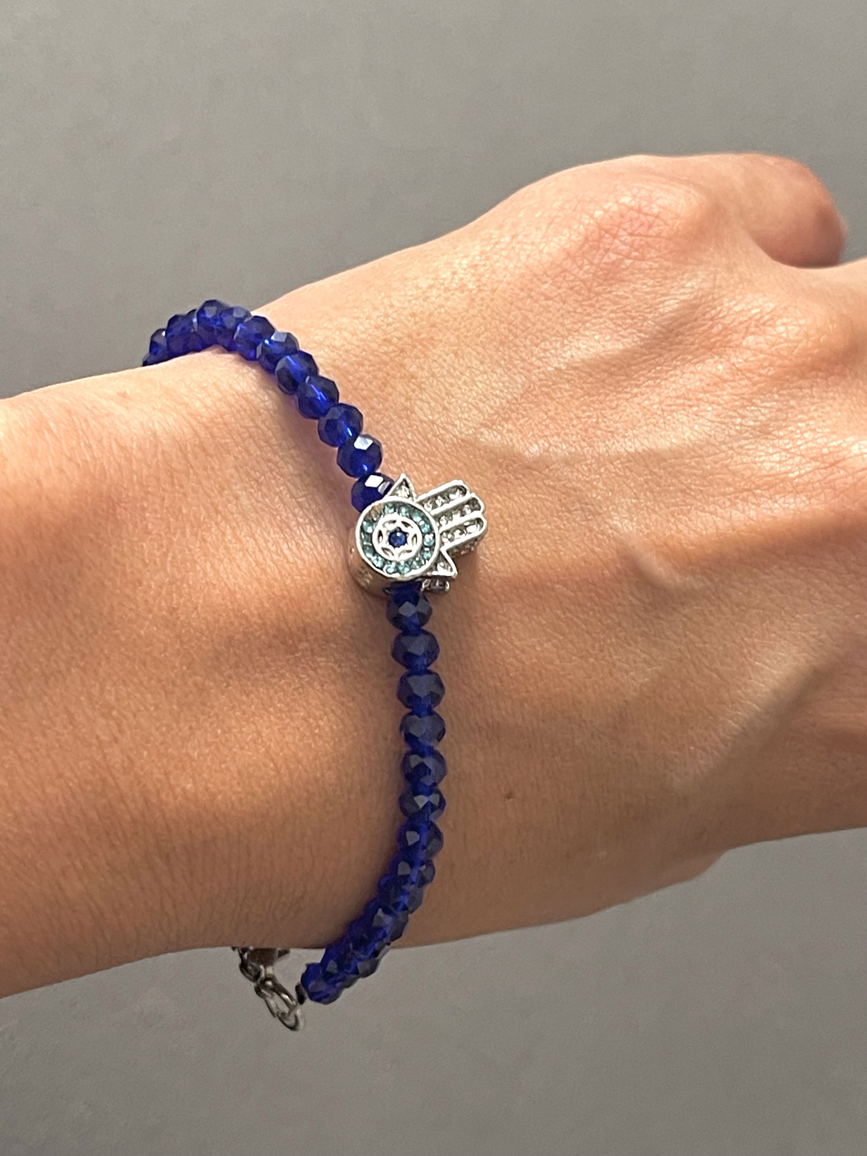 Pulsera de cristales con cristales azules y dije d emanó de Fátima . Terminaciones de acero quirúrgico 316 L