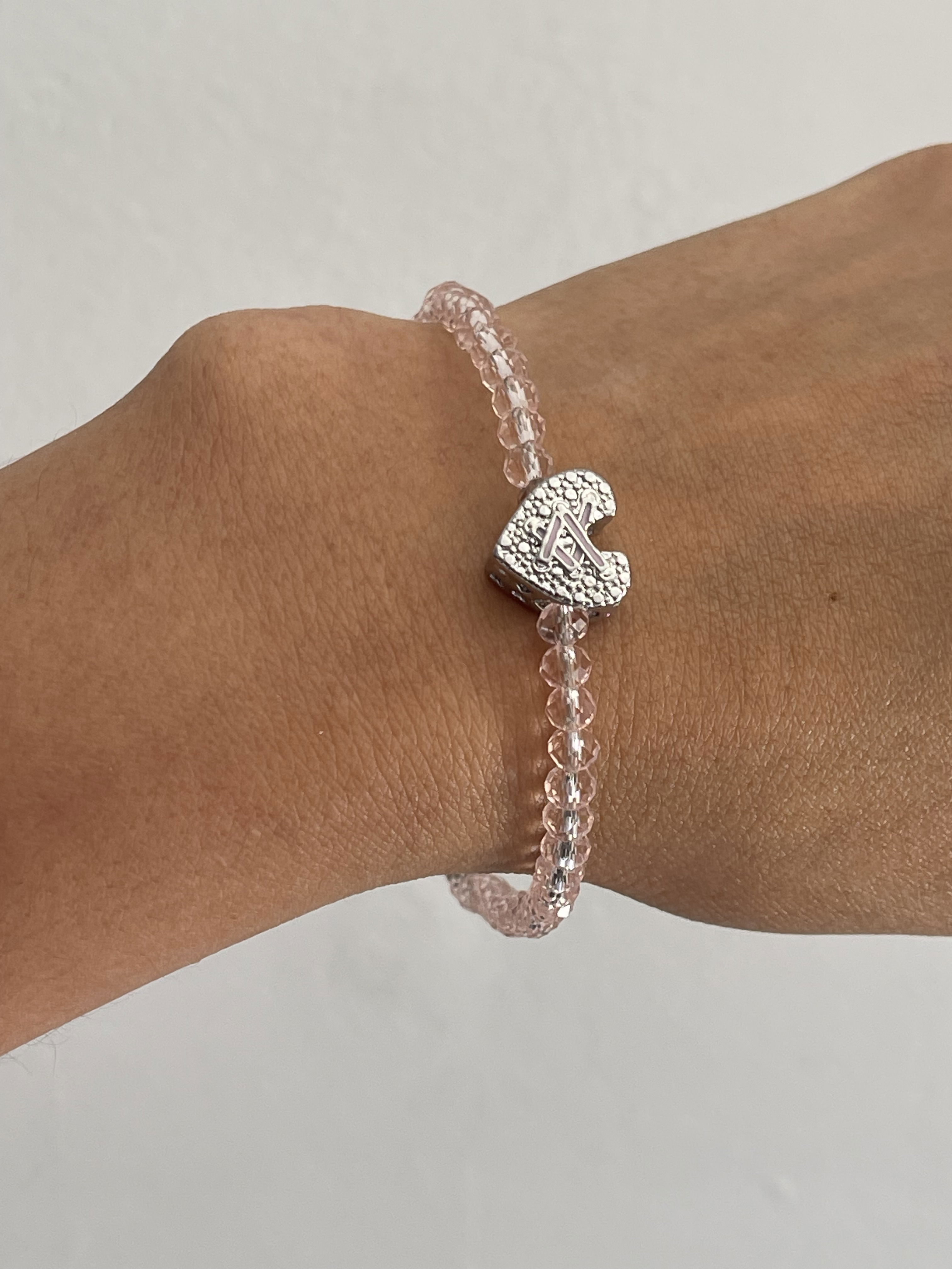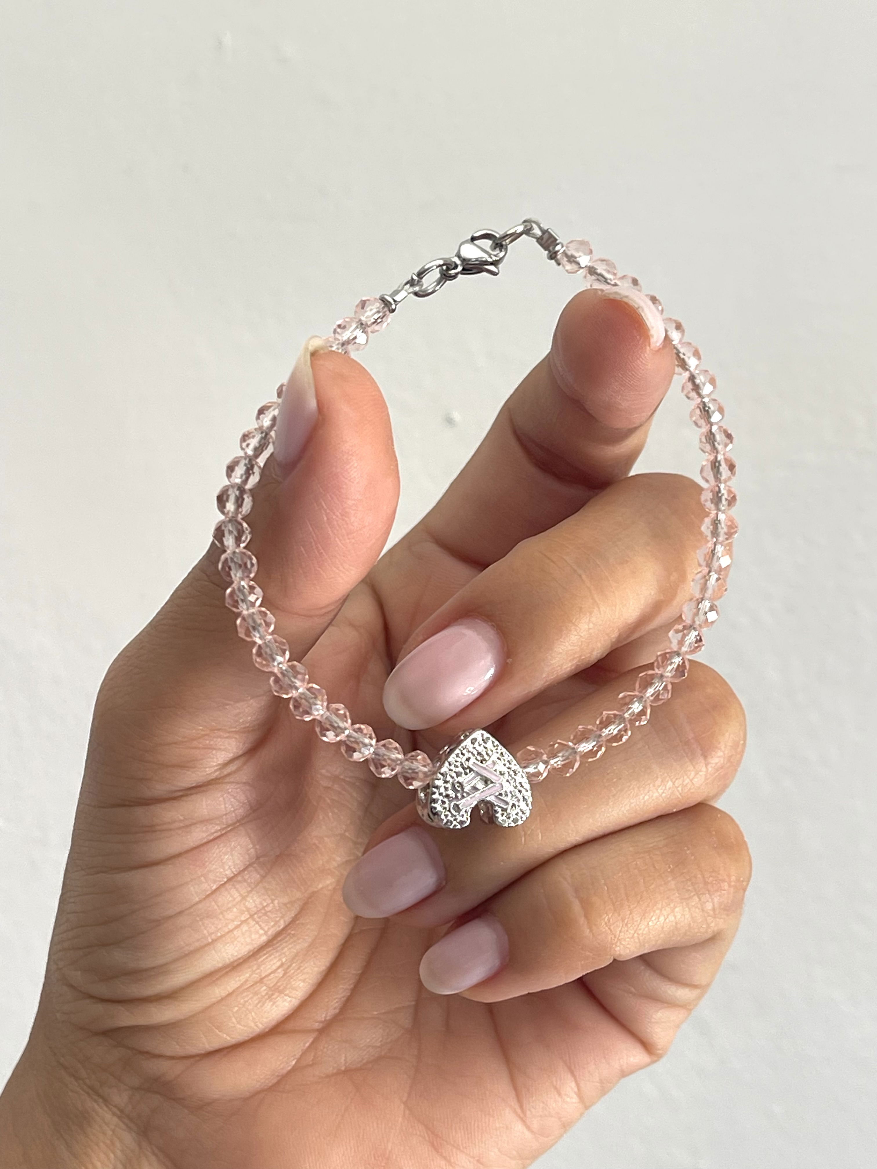 Pulsera de cristales rosa bebé con dije en forma de corazón . Fornituras de acero quirúrgico .
