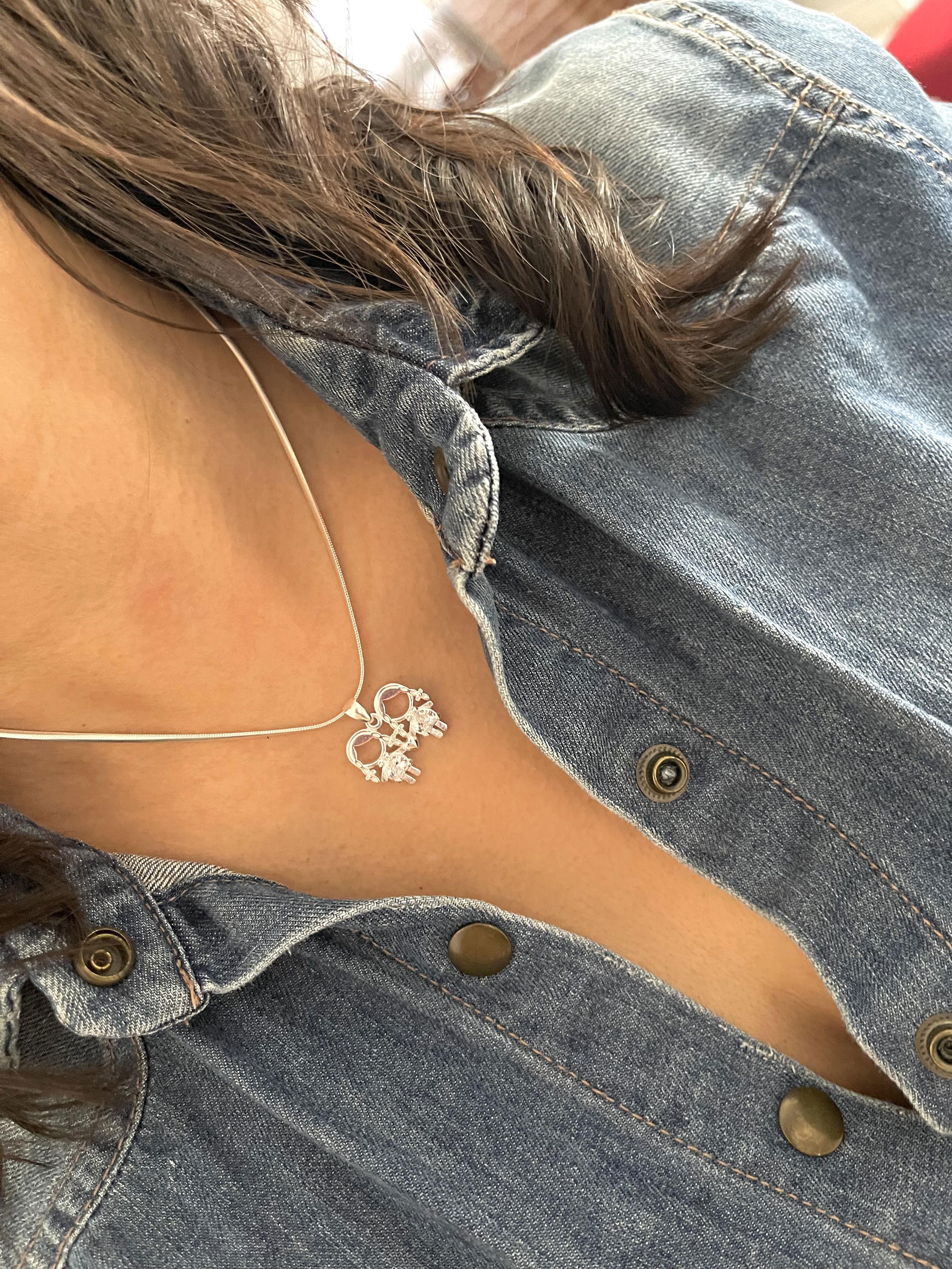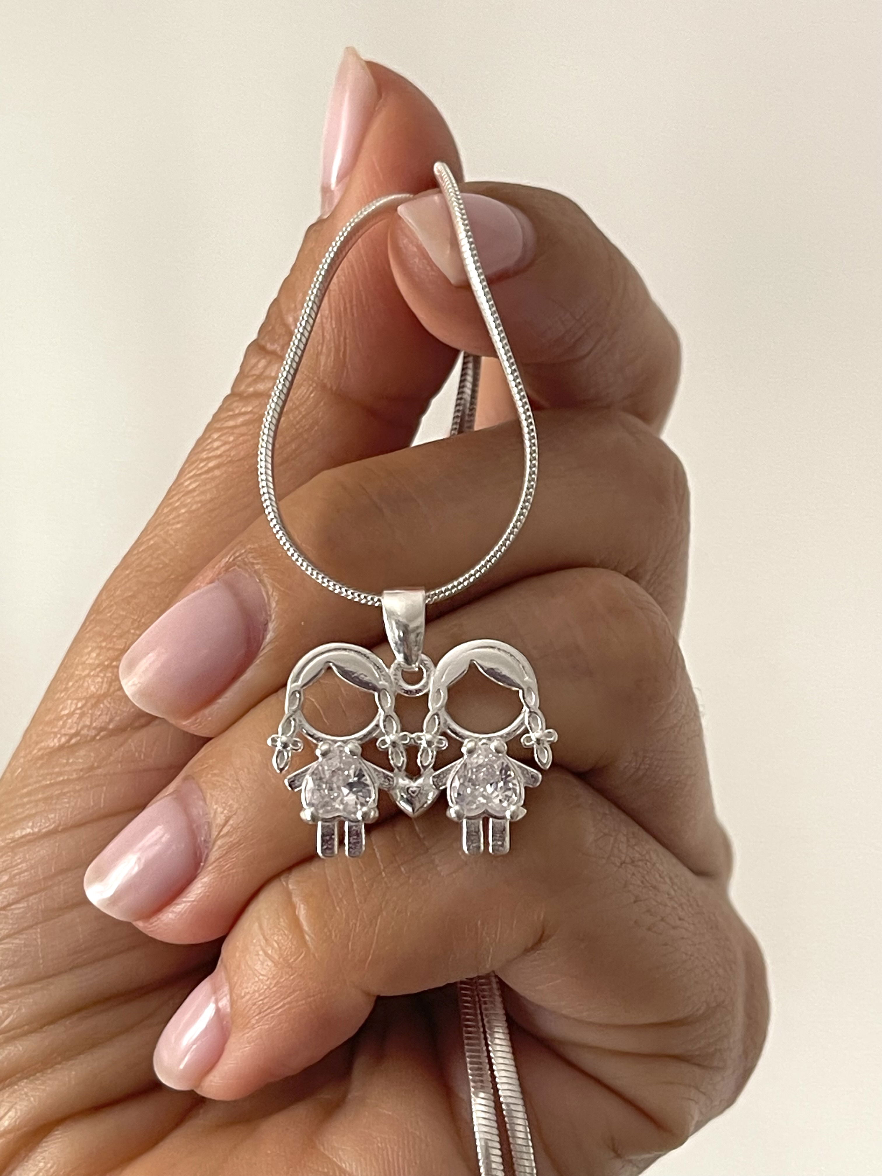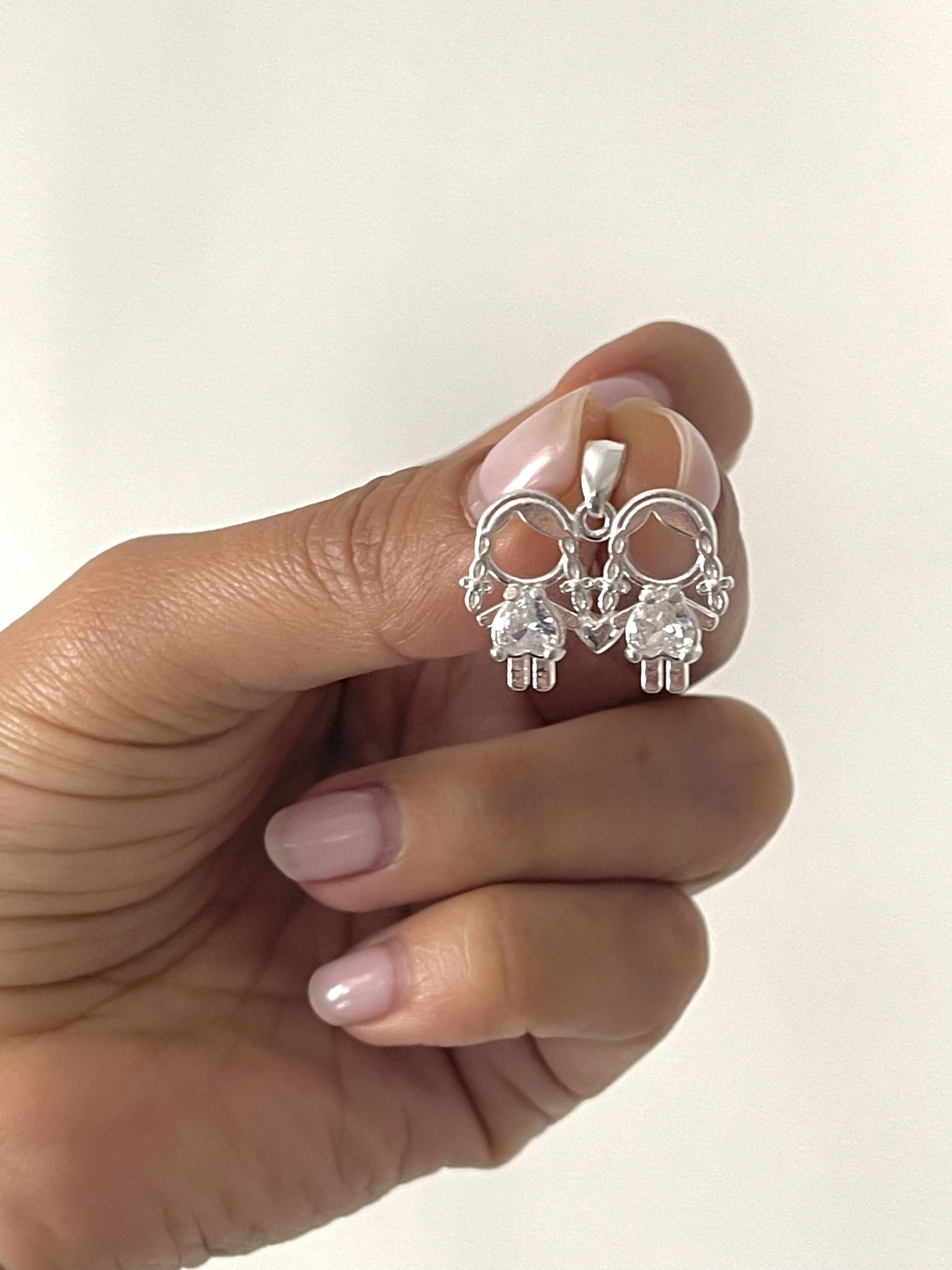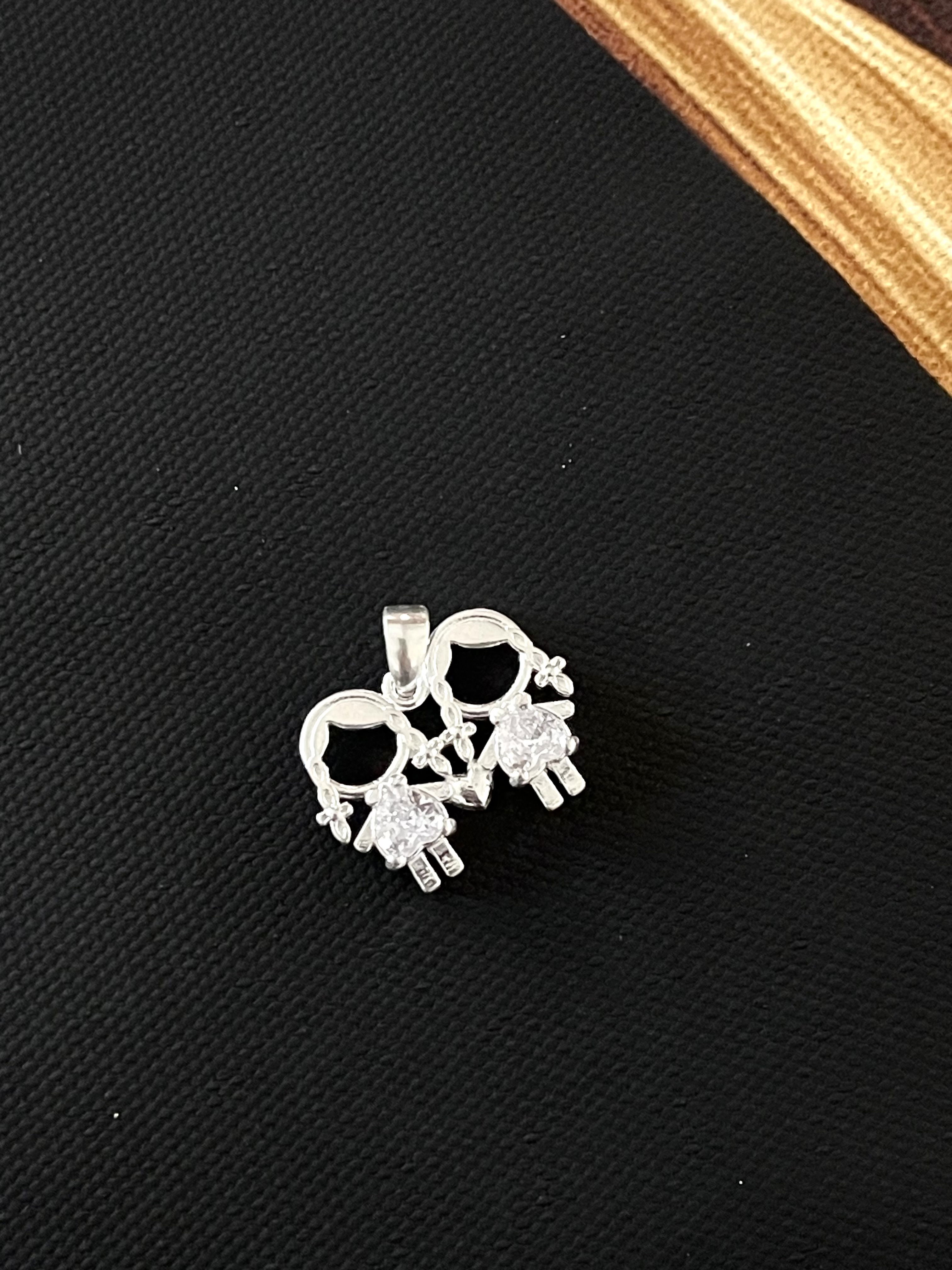 Dije de dos nenas de la mano unidas por un corazón pequeño , con diseño de plata lisa y una zirconia en el centro en forma de corazón . peso : 3,2 grs .