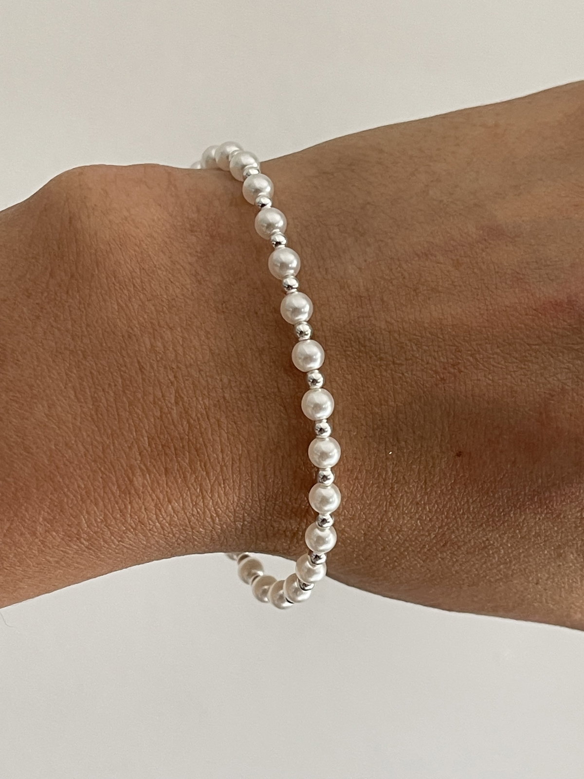 pulsera con perlas y bolitas de plata intercaladas . Com extensor