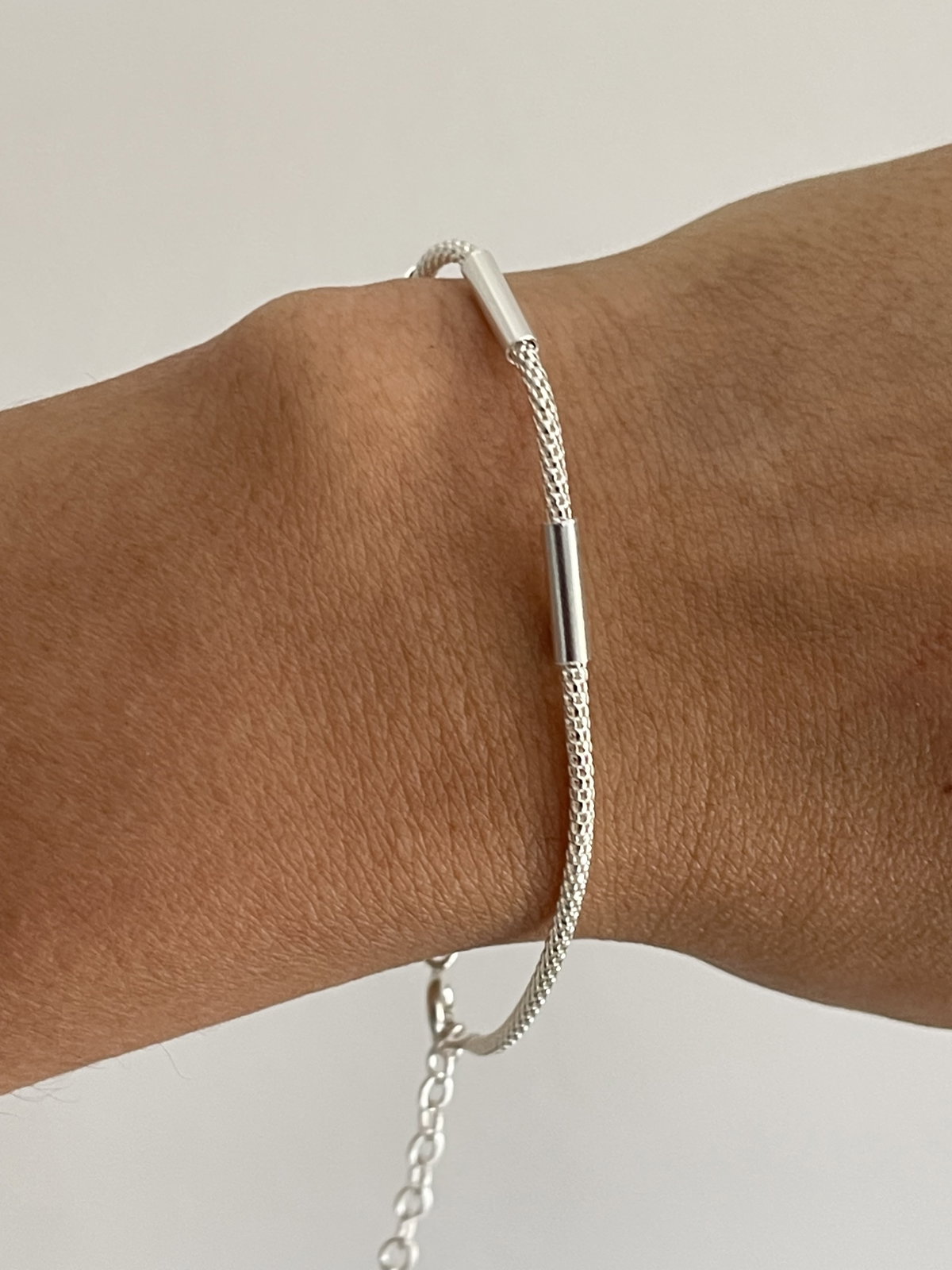 Modelo de pulsera canasta combinado con tubos de plata lisa .