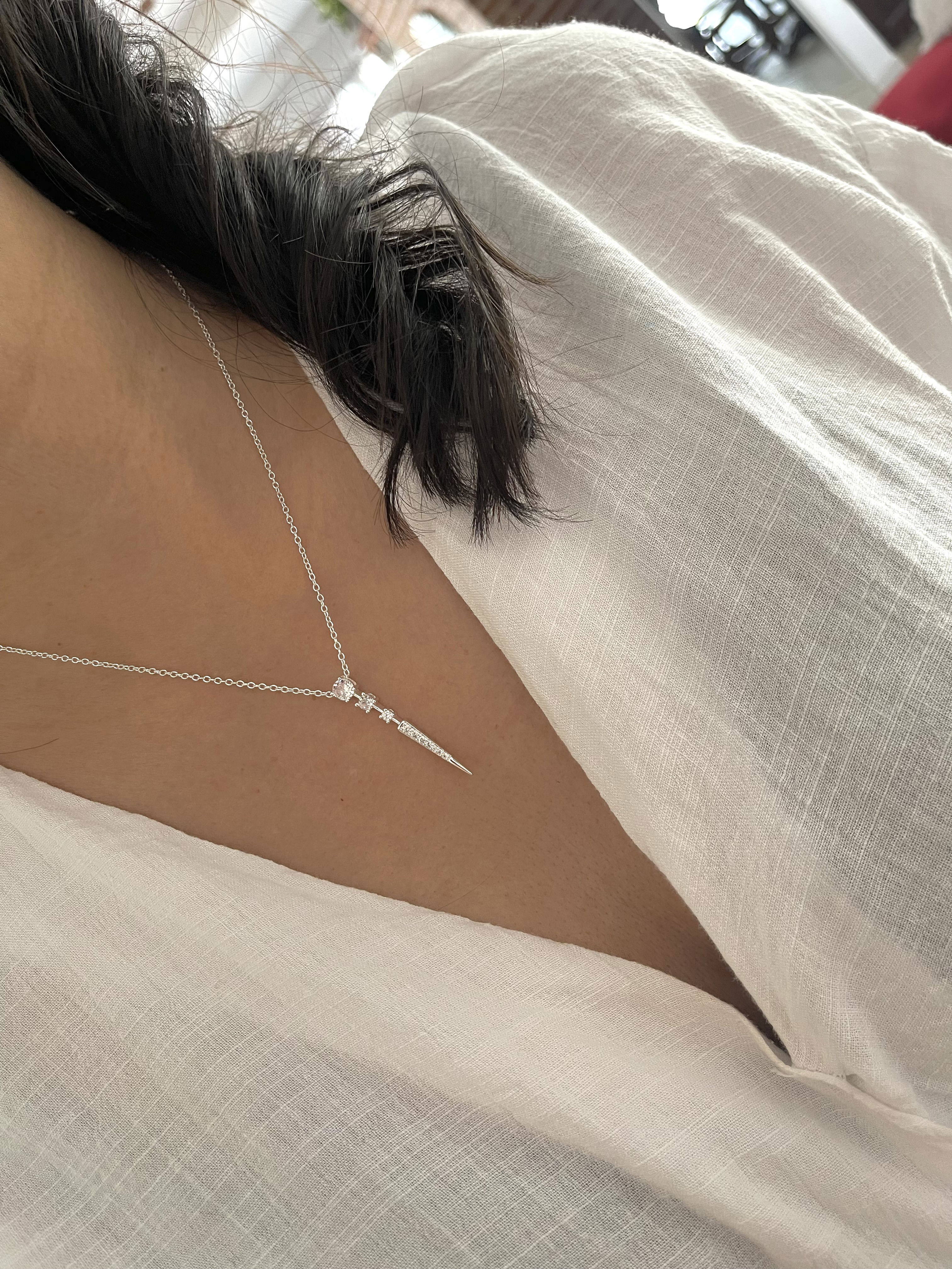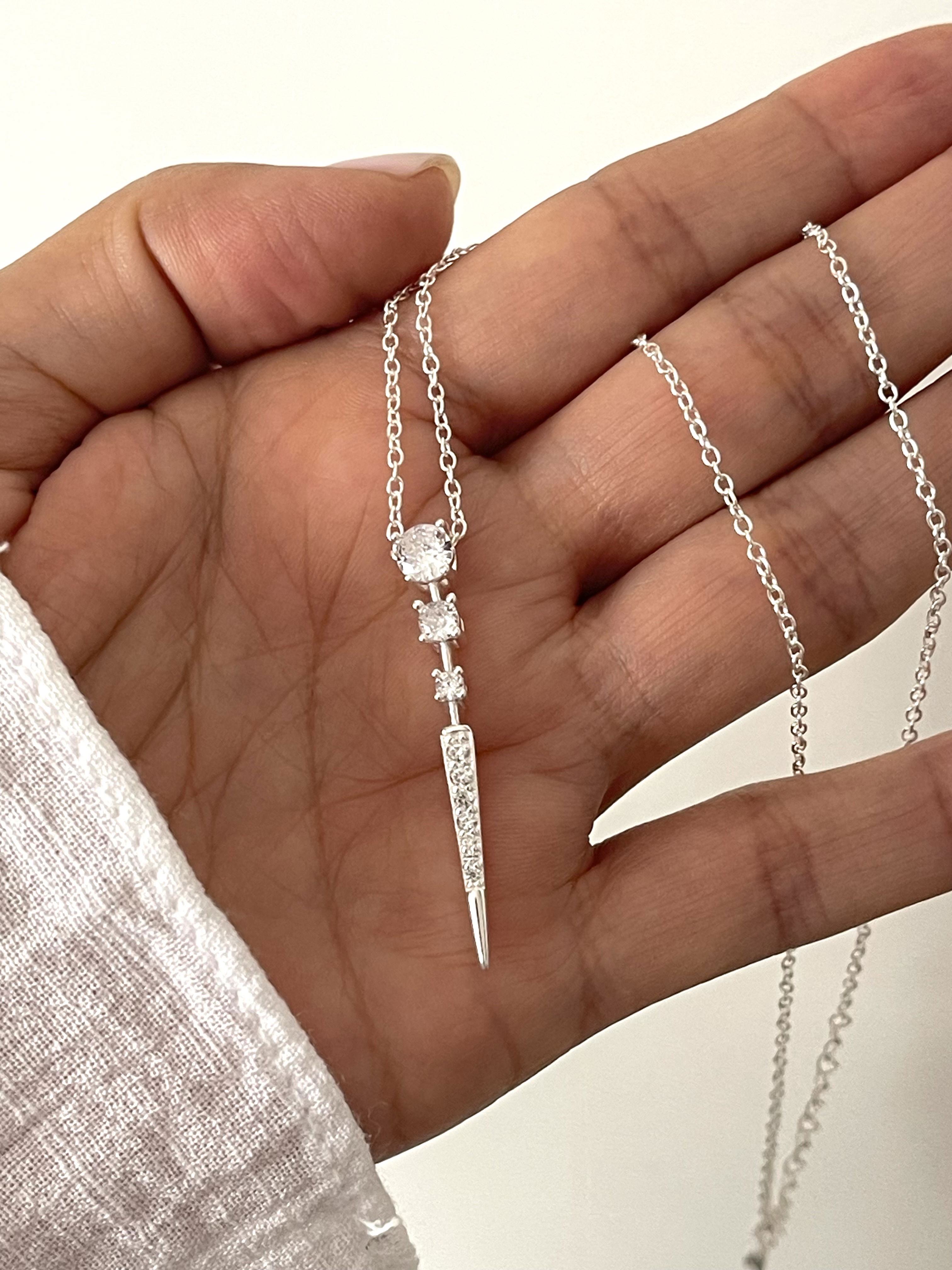 Conjunto cadena y dije incorporado con una barra termina en punta y 3 zirconias con micropave .
