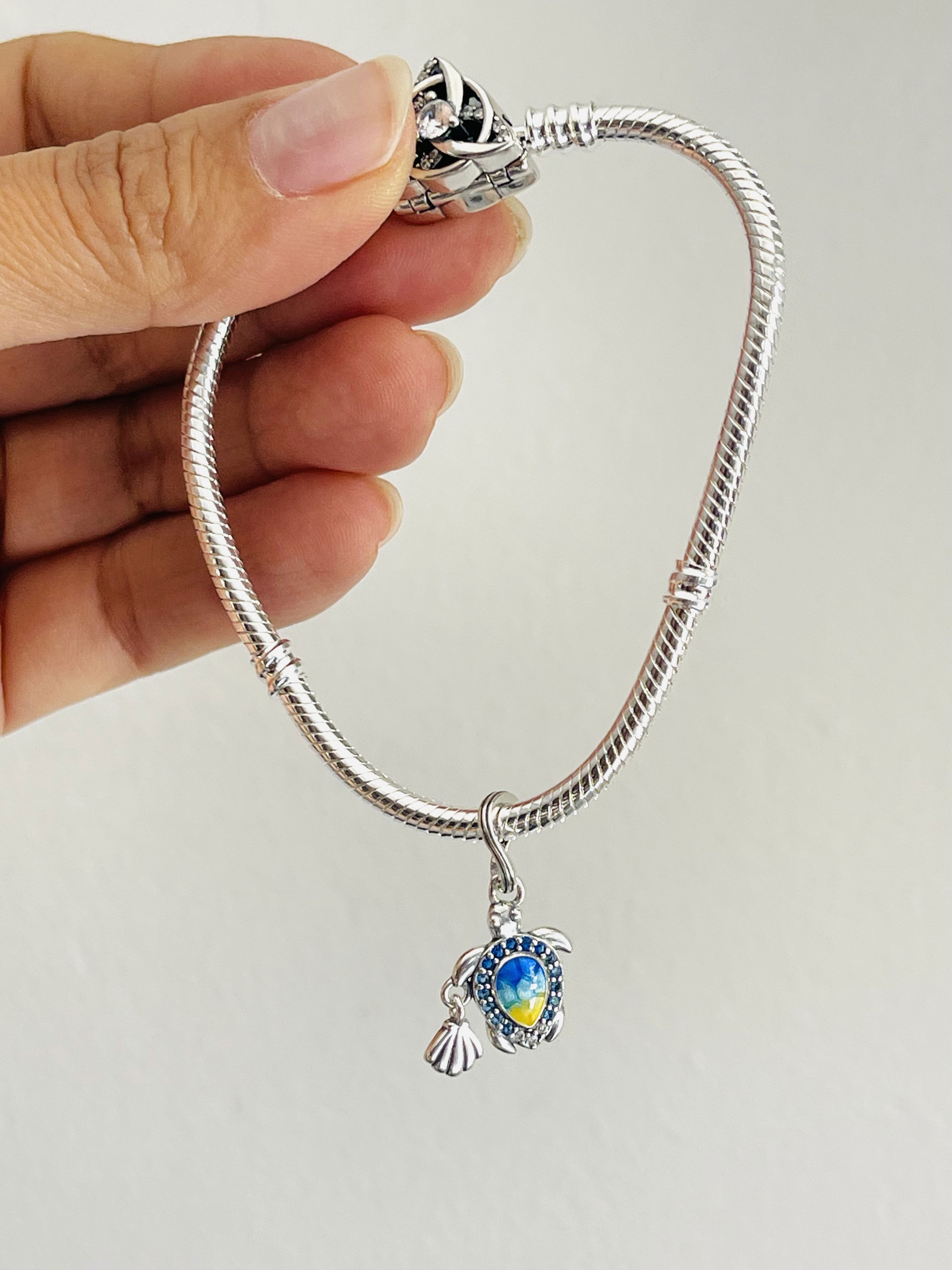 Dije Charms de tortuga marina con colores azul amarillo y verde combinada con esmaltado y micropave en tonos azules . Con pequeño dije de ostra en plata lisa
