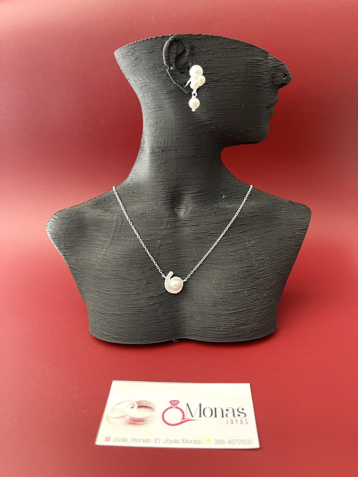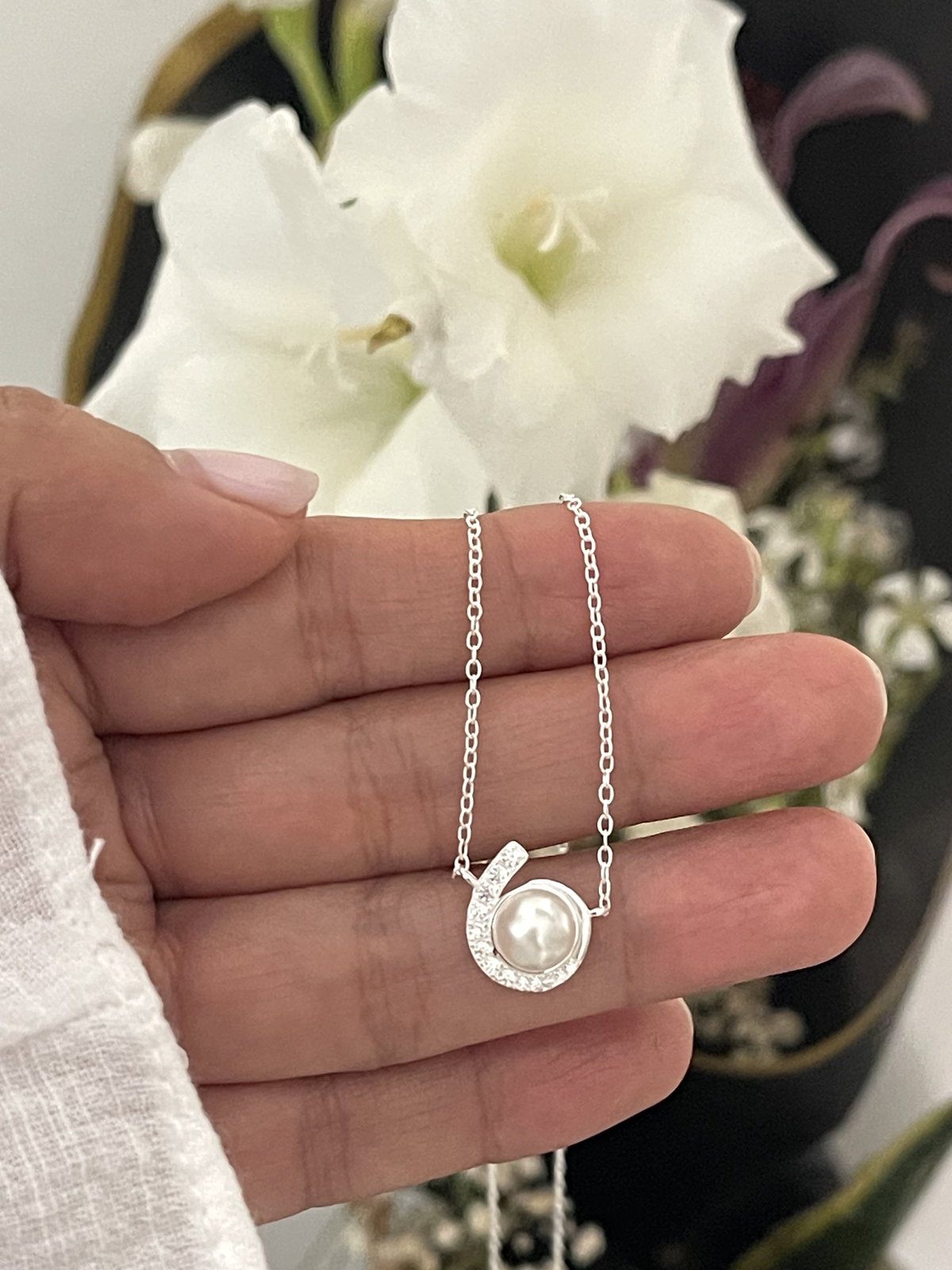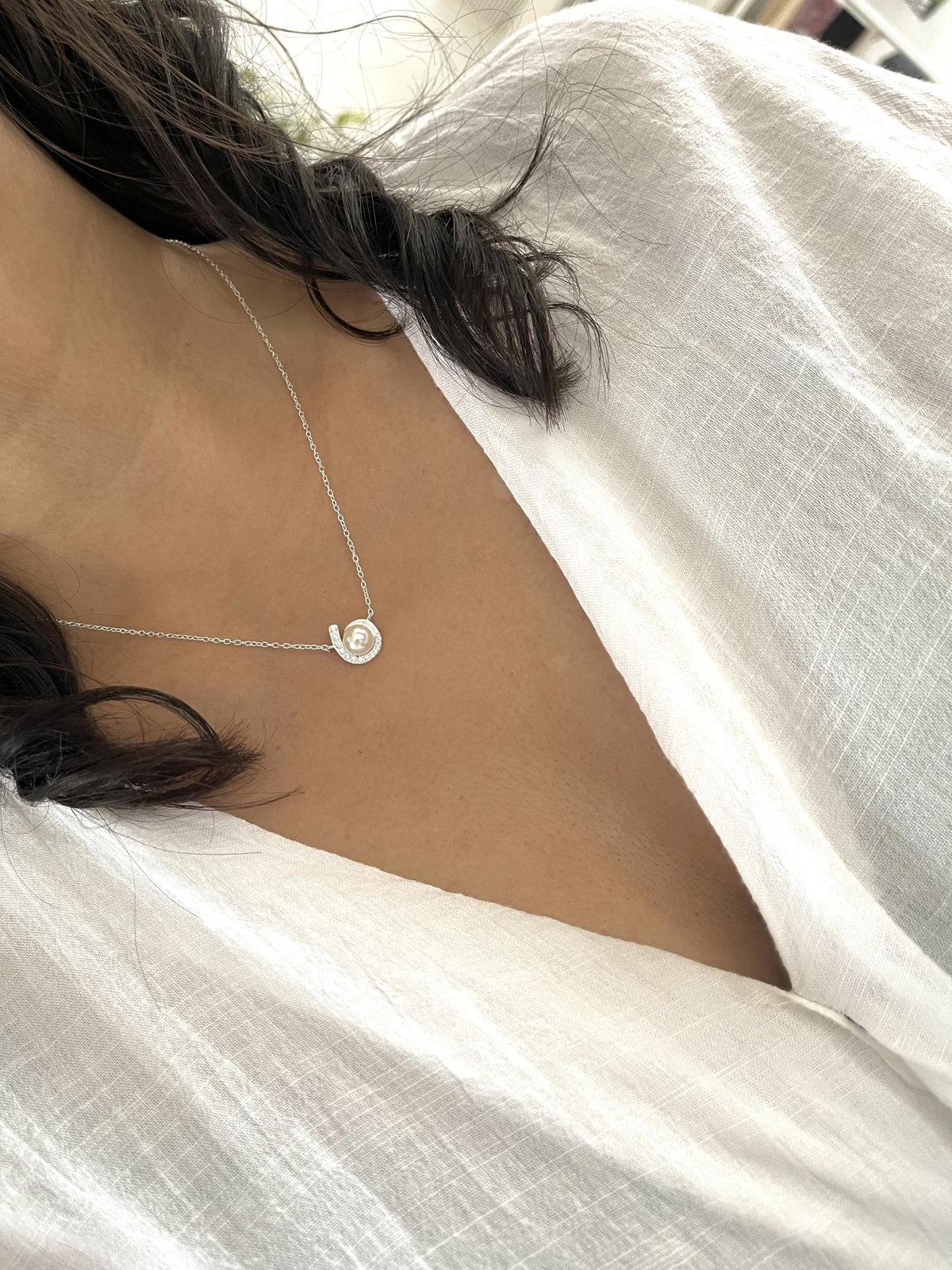 Conjunto de cadena y dije d e perla con pequeño detalle con micropave . peso : 2,8 grs