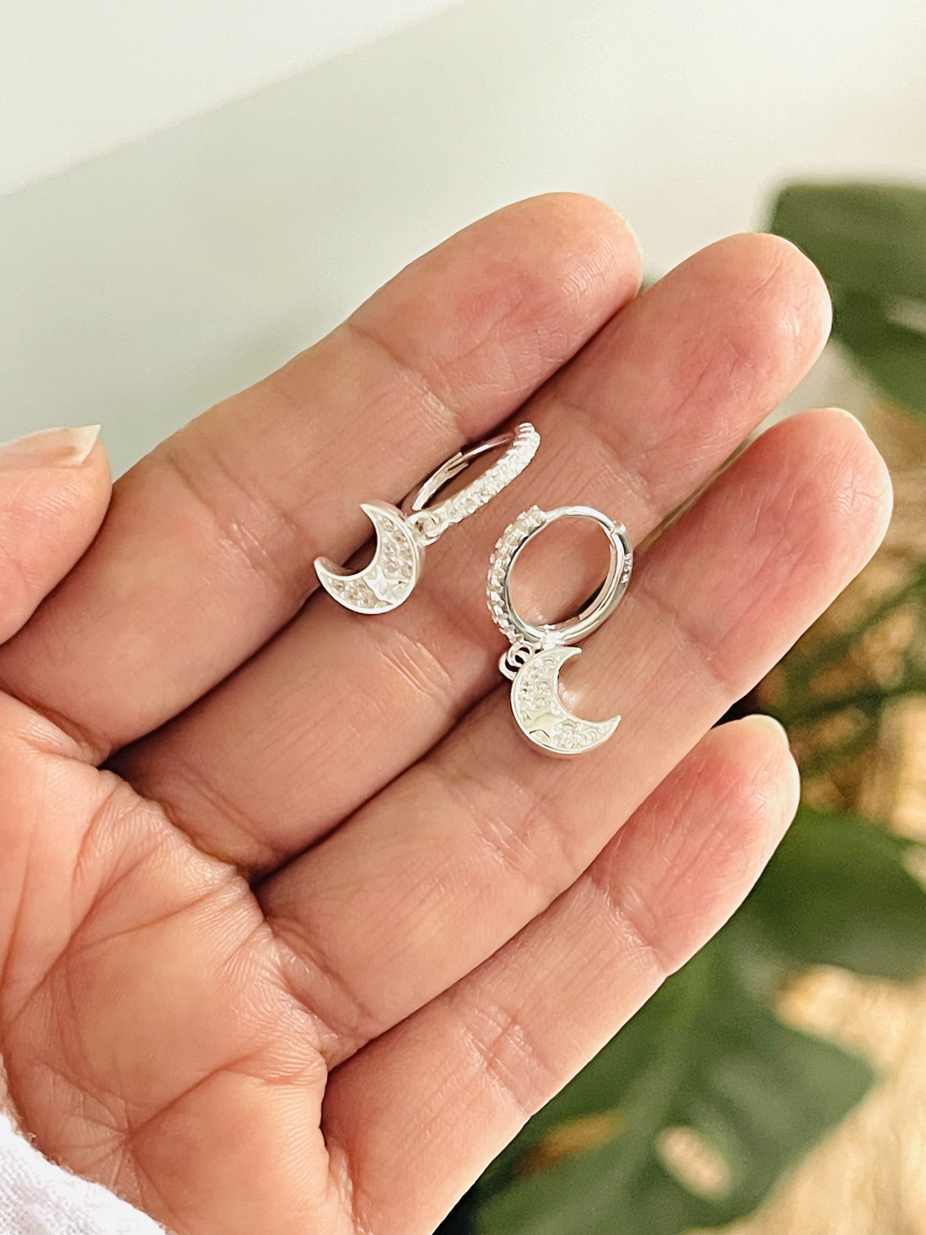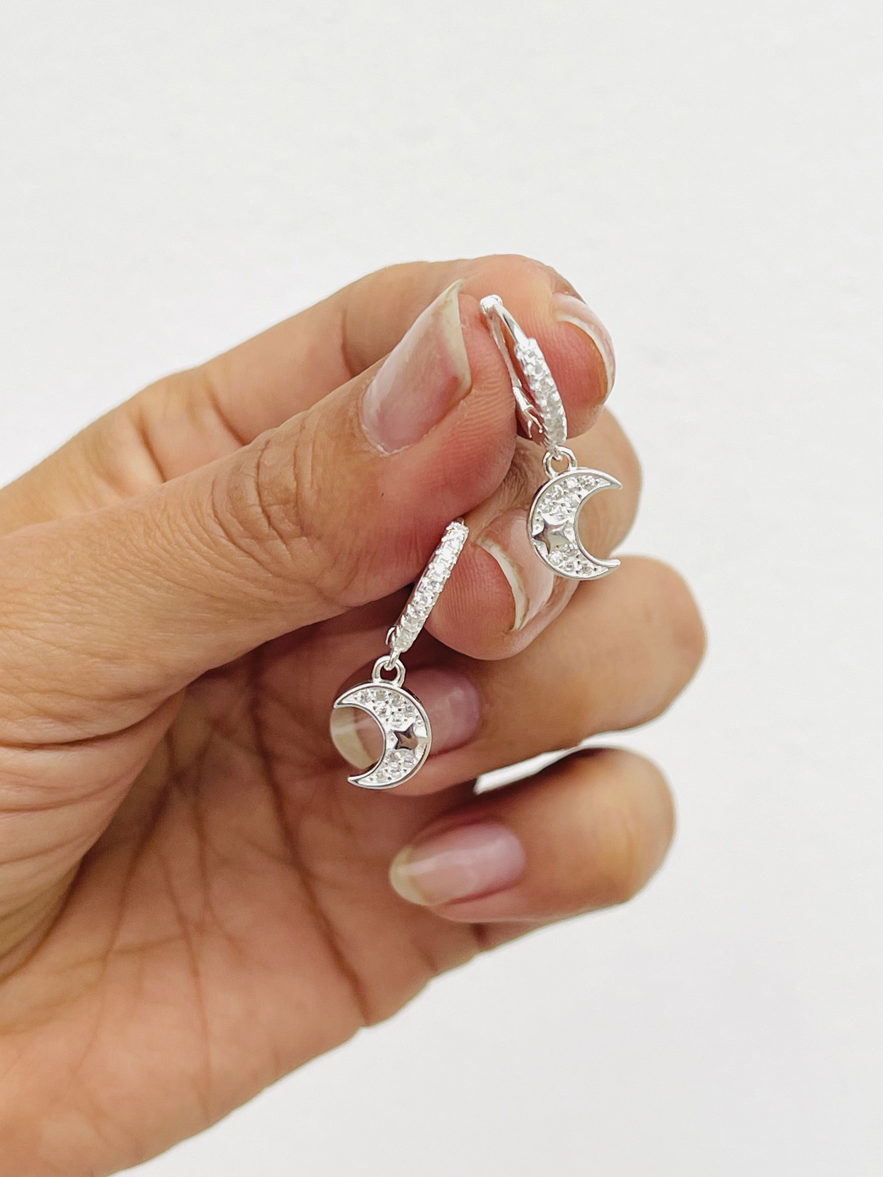 Argollas de micropave con dije de luna y detalles de estrellas dentro de la misma luna .