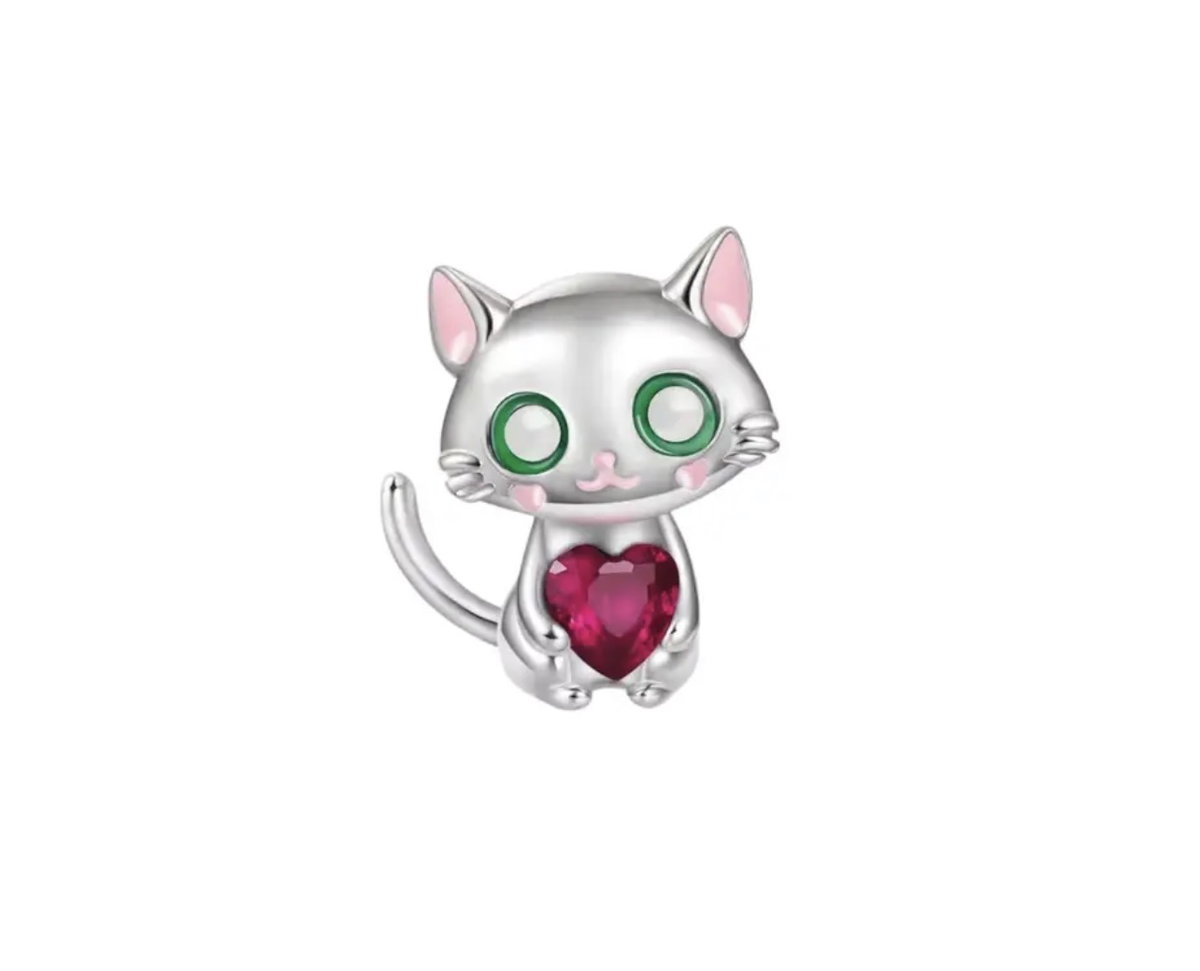 Dije de gato con detalles esmaltados y corazón en centro . De cristal zirconia rojo .