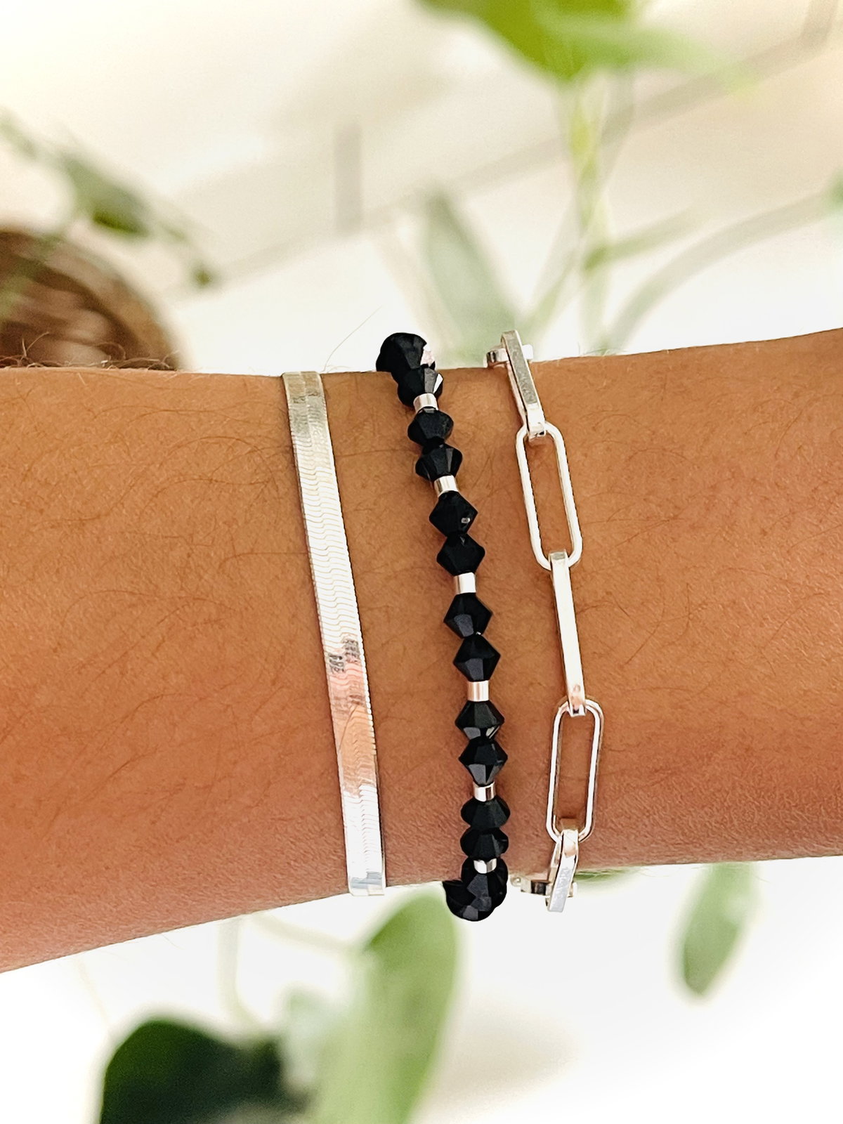 Pulsera con cristales negros opacos biconos de sw con tubos de 2 mm lisos y fornituras de plata 925