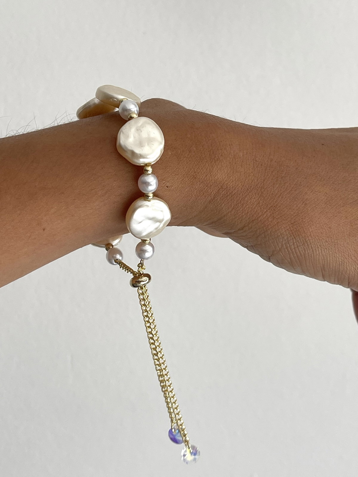 Pulsera de perlas ( símil ) con cadena y cierre siliconado .