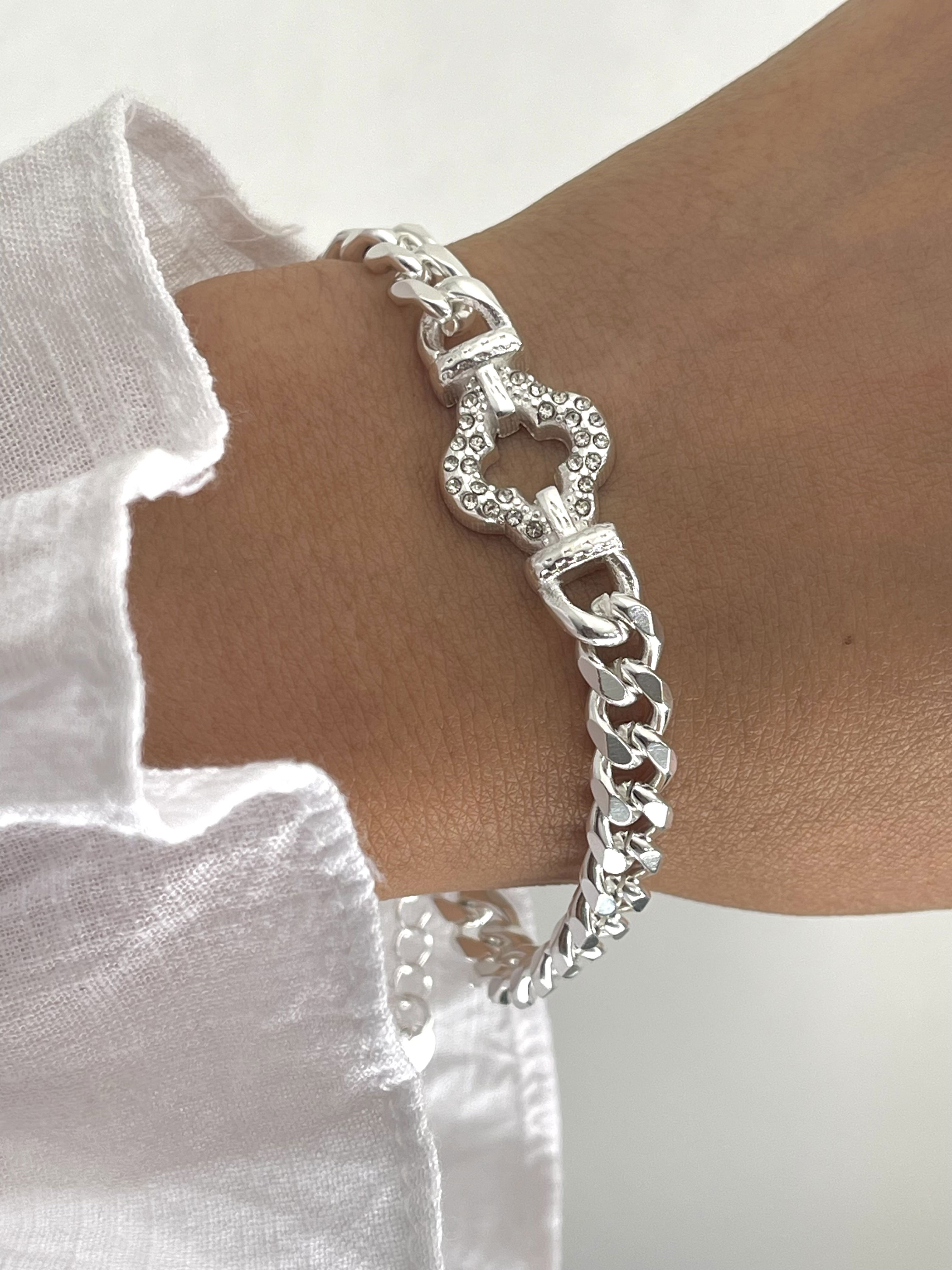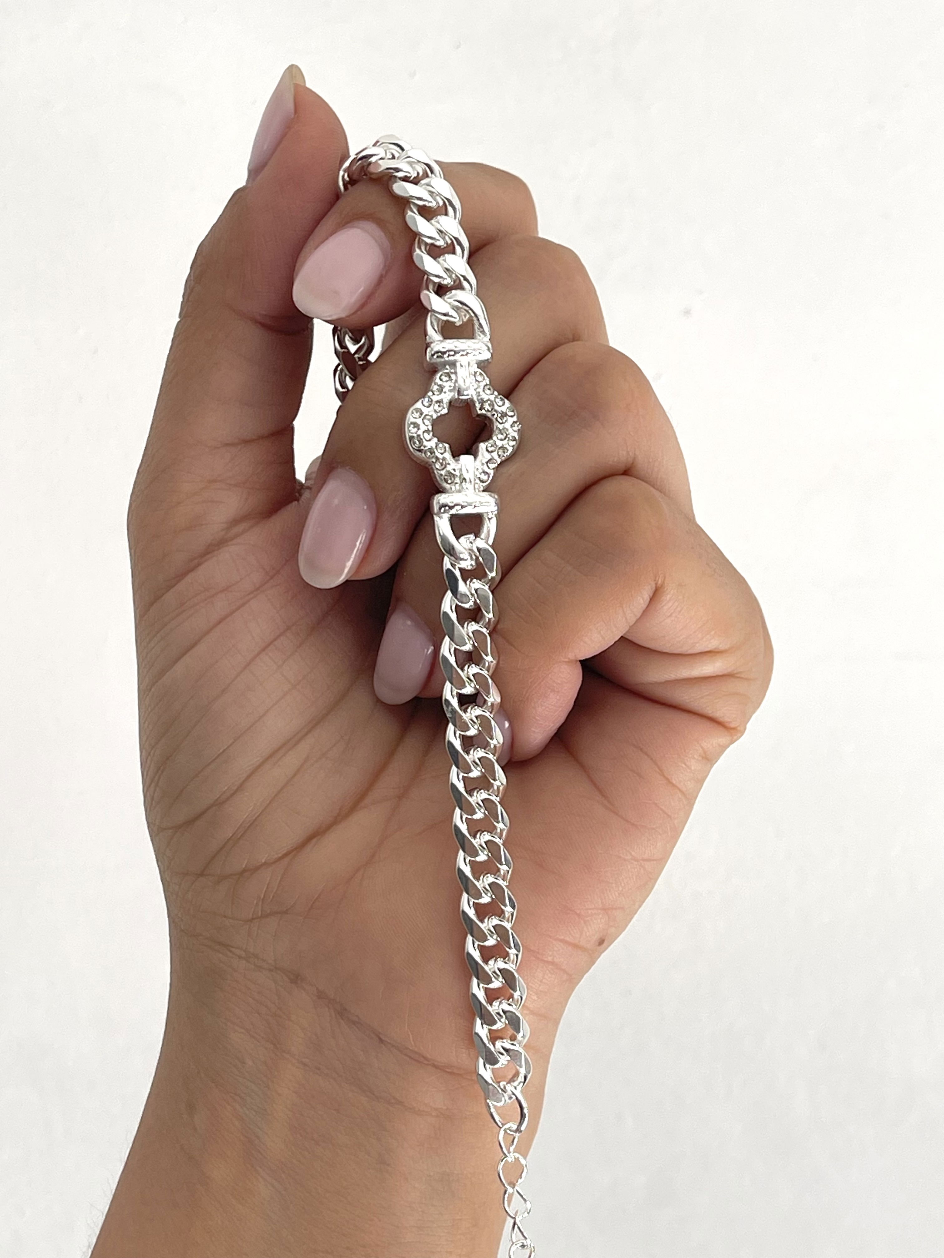 Pulsera Cadena modelo Gourmet gruesa col dije en centro en forma de trébol con micropave . medidas :17 cm +4 cm extensor total 21 cm